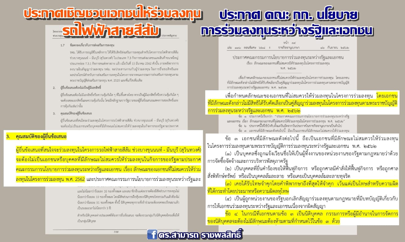 ในประกาศเชิญชวนดังกล่าว ได้ระบุไว้ชัดใน “ข้อ 3 คุณสมบัติของผู้ยื่นข้อเสนอ” ว่า “ผู้ยื่นข้อเสนอจะต้องไม่เป็นเอกชนหรือบุคคลที่มีลักษณะไม่สมควรให้ร่วมลงทุนในกิจการของรัฐตามประกาศคณะกรรมการนโยบายการร่วมลงทุนระหว่างรัฐและเอกชน เรื่อง ลักษณะของเอกชนที่ไม่สมควรให้ร่วมลงทุนในโครงการร่วมลงทุน พ.ศ. 2562”