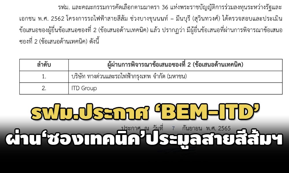 “รฟม. และคณะกรรมการคัดเลือกตามมาตรา 36 แห่งพระราชบัญญัติการร่วมลงทุนระหว่างรัฐและเอกชน พ.ศ. 2562 โครงการรถไฟฟ้าสายสีส้ม ช่วงบางขุนนนท์-มีนบุรี (สุวินทวงศ์) ได้ตรวจสอบและประเมินข้อเสนอของผู้ยื่นข้อเสนอซองที่ 2 (ข้อเสนอด้านเทคนิค) แล้ว ปรากฎว่า มีผู้ยื่นข้อเสนอที่ผ่านการพิจารณาข้อเสนอซองที่ 2 (ข้อเสนอด้านเทคนิค) ดังนี้ 1.บริษัท ทางด่วนและรถไฟฟ้ากรุงเทพ จำกัด (มหาชน) และ2.ITD Group” ประกาศ รฟม. ณ วันที่ 7 ก.ย.2565 ลงนามโดยนายภคพงศ์ ศิริกันทรมาศ ผู้ว่าการ รฟม. ระบุ