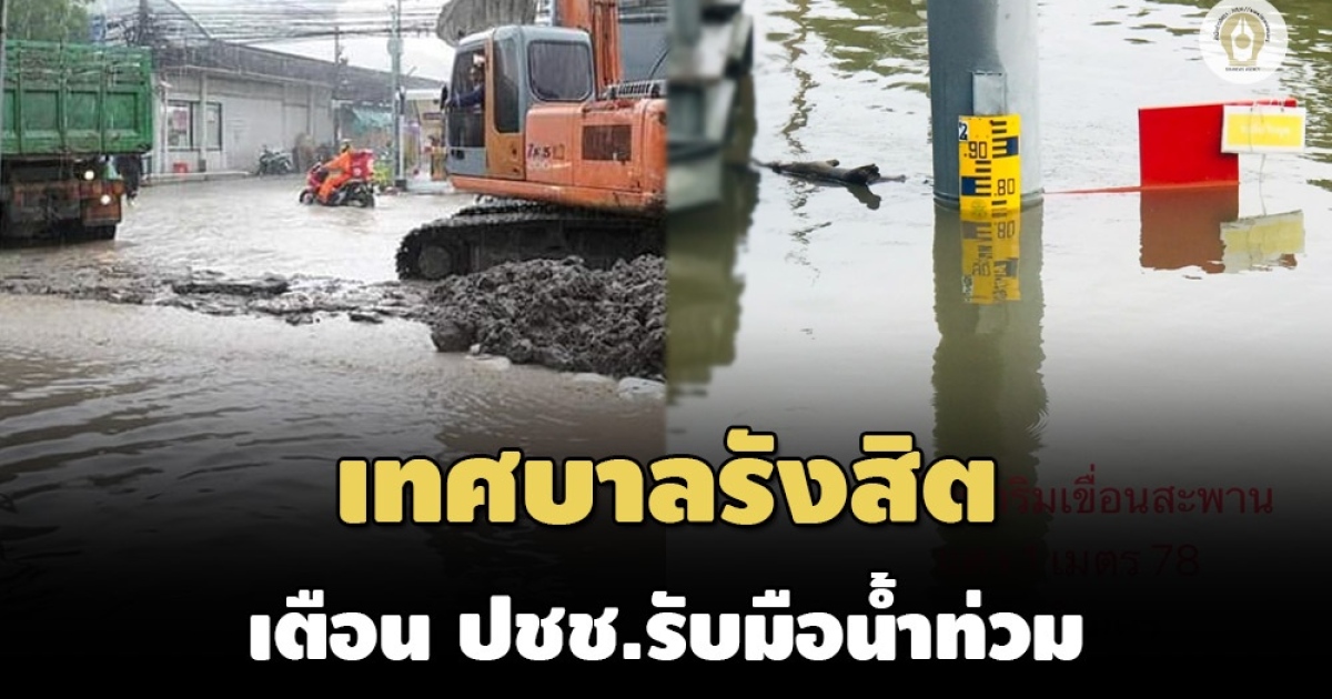 เทศบาลรังสิต จังหวัดปทุมธานี รายงานสถานการณ์น้ำอยู่ระดับธงส้ม หลังฝนตกสะสมต่อเนื่องตั้งแต่คืนวานนี้ เตือน ปชช.รับมือน้ำท่วม อพยพเคลื่อนของขึ้นที่สูง ติดตามข่าวใกล้ชิด