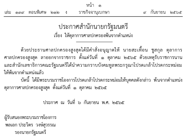 บัดนี้ได้มีพระบรมราชโองการโปรดเกล้าฯให้บุคคลดังกล่าว พ้นจากตำแหน่งตุลาการศาลปกครองสูงสุด ตั้งแต่วันที่ 1 ต.ค.2565