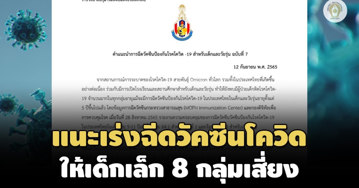 ผู้สื่อข่าวรายงานว่า เมื่อวันที่ 14 ก.ย. 2565 เว็บไซต์ราชวิทยาลัยกุมารแพทย์แห่งประเทศไทย เผยแพร่คำแนะนำการฉีดวัคซีนป้องกันโรคโควิด-19 สำหรับเด็กและวัยรุ่น ฉบับที่ 7 ลงวันที่ 12 ก.ย. 2565 ระบุว่า