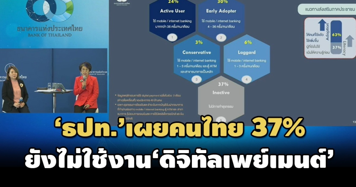 ‘ธปท.’ เผยคนไทย 37% ยังไม่มีการใช้งาน ‘ดิจิทัลเพย์เมนต์’ ขณะที่ 54% ใช้งานค่อนข้างมาก พร้อมเดินหน้าพัฒนาระบบ ‘PromptBiz’ สนับสนุนการชำระเงินทางดิจิทัลของภาคธุรกิจ คาดเปิดให้บริการเฟสแรก ไตรมาส 1 ปีหน้า