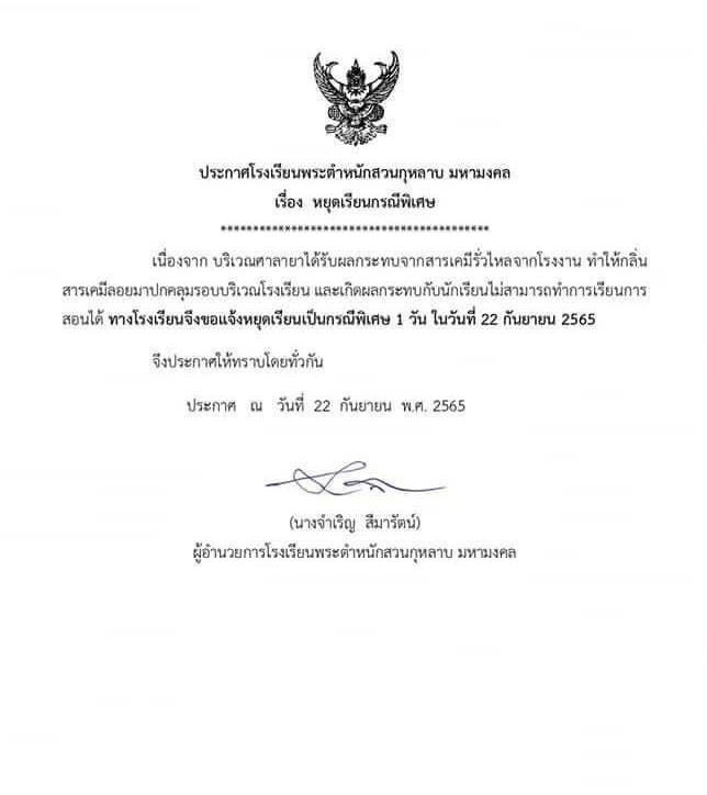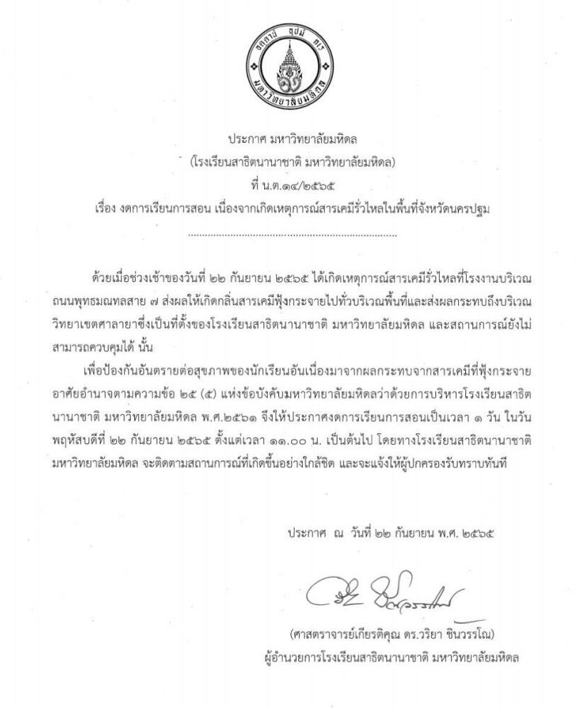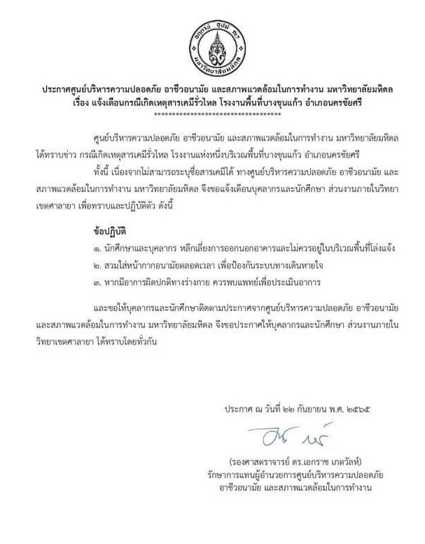ขณะที่ล่าสุดมีหนังสือ ประกาศศูนย์บริการความปลอดภัย อาชีวอนามัย เเละสภาพแวดล้อมในการทำงาน มหาวิทยาลัยมหิดล เรื่องเเรงเตือนกรณีเกิดเหตุสารเคมีรั่วไหล โรงงานพื้นที่บางขุนเเก้ว อำเภอนครชัยศรี ระบุว่า