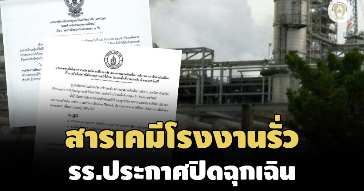สารเคมีรั่วไหลจากโรงงานย่านนครชัยศรี ส่งกลิ่นคลุ้ง กระทบถึงศาลายา เขตแจ้งเตือน 3 โรงเรียนประกาศหยุดเรียนเป็นกรณีพิเศษ