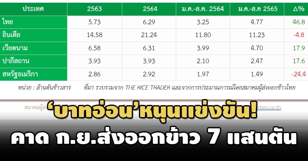 เมื่อวันที่ 30 ก.ย. สมาคมผู้ส่งออกข้าวไทย คาดการณ์ปริมาณการส่งออกข้าวไทยในเดือน ก.ย.2565 โดยคาดว่าไทยจะส่งออกข้าวได้ 7 แสนตัน เนื่องจากผู้ส่งออกยังมีสัญญาที่ค้างส่งมอบจากเดือนก่อน อันเป็นผลจากการขนถ่ายสินค้าขึ้นเรือทำได้ไม่เต็มที่ เพราะสภาพอากาศไม่เอื้ออำนวยจากฝนที่ตกลงมาเป็นระยะๆ อีกทั้งการที่อินเดียมีมาตรการระงับการส่งออกข้าวหัก และกำหนดภาษีส่งออกข้าวขาวที่อัตรา 20% คาดว่าจะเป็นผลดีต่อการส่งออกข้าวของไทย