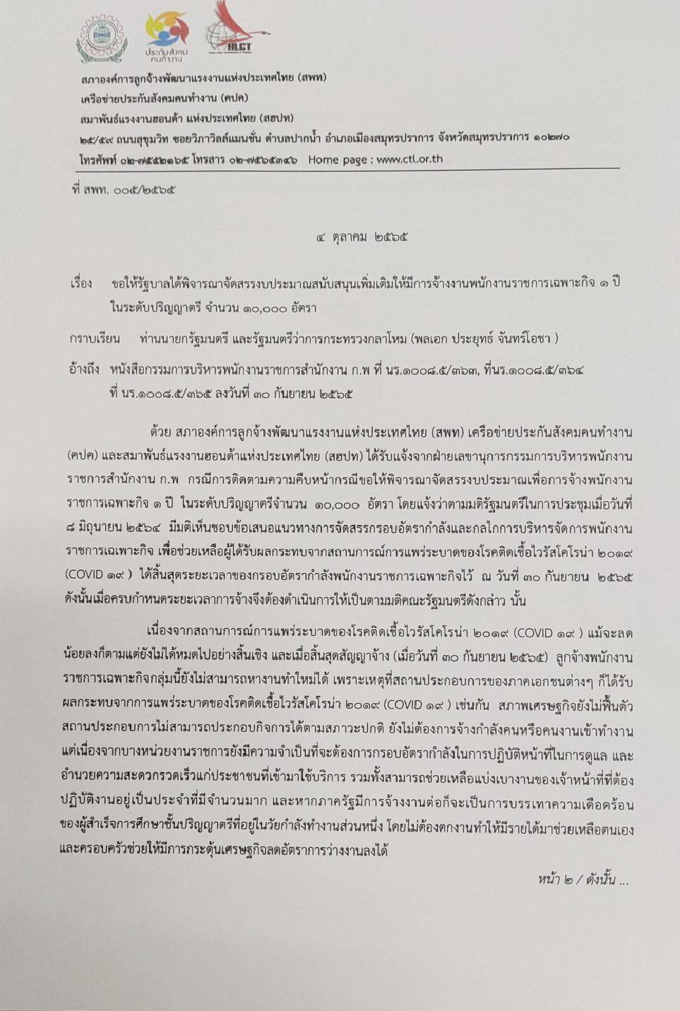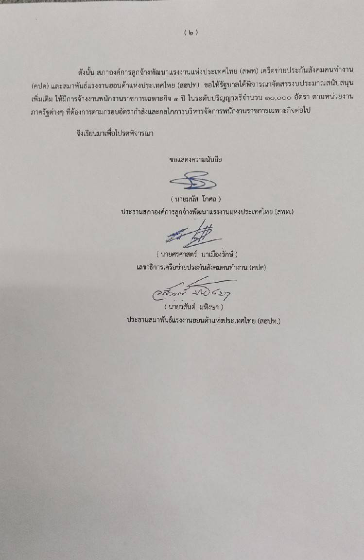 ดังนั้น สภาองค์การลูกจ้างพัฒนาแรงานแห่งประเทศไทย (สพท.) เครือข่ายประกันสังคมคนทำงาน (คปค.) และสมาพันธ์แพงงานชอนคำาแห่งประเทศไทย (สอปท.) ขอให้รัฐบาลได้พิจารณาจัดสรรบประมาณสนับสนุนเพิ่มเติม ให้มีการจ้างงานพนักงานราชการเฉพาะกิจ 1 ปี ในระดับปริญญาตรีจำนวน 10,000 อัตรา ตามหน่วยงานภาครัฐต่างๆ ที่ต้องการตามกรอบอัตรากำลังและกลไกการบริหารจัดการพนักงานราชการเฉพาะกิจต่อไป” หนังสือระบุ