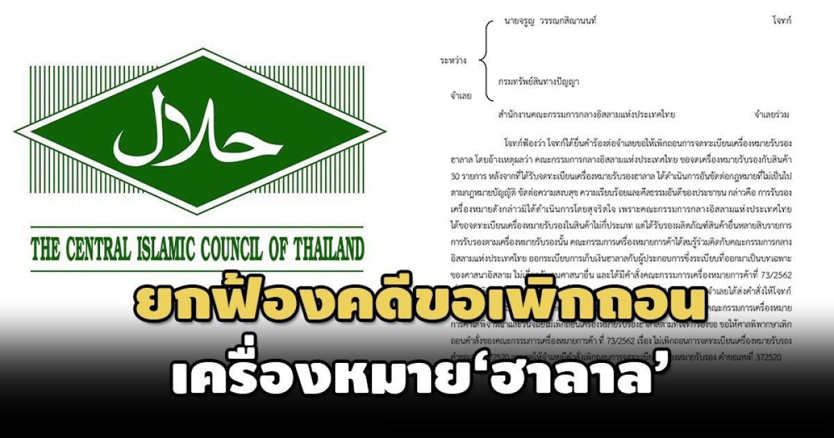 เมื่อวันที่ 19 ต.ค. ศาลทรัพย์สินทางปัญญาและการค้าระหว่างประเทศกลาง อ่านคำพิพากษาในคดีหมายเลขดำที่ ทป 195/2562 คดีหมายเลขแดงที่ ทป 223/2565 ซึ่งเป็นคดีที่นายจรูญ วรรณกสิณานนท์ ตัวแทนกลุ่มชาวพุทธพลังแผ่นดิน (โจทก์) ยื่นฟ้องกรมทรัพย์สินทางปัญญา (จำเลย) และสำนักงานคณะกรรมการกลางอิสลามแห่งประเทศไทย (จำเลยร่วม) ให้เพิกถอนการจดทะเบียนเครื่องหมายรับรอง ‘ฮาลาล’
