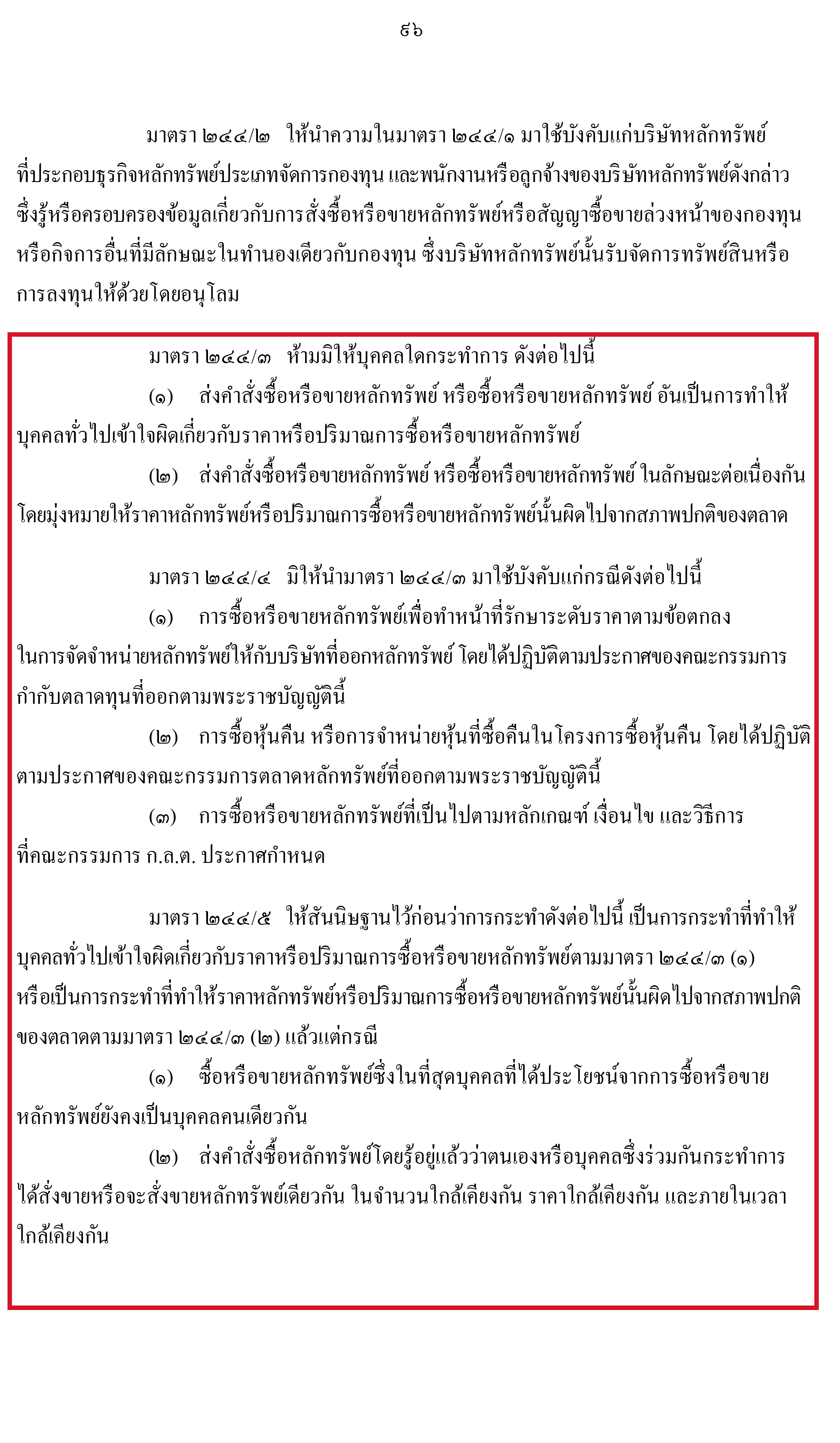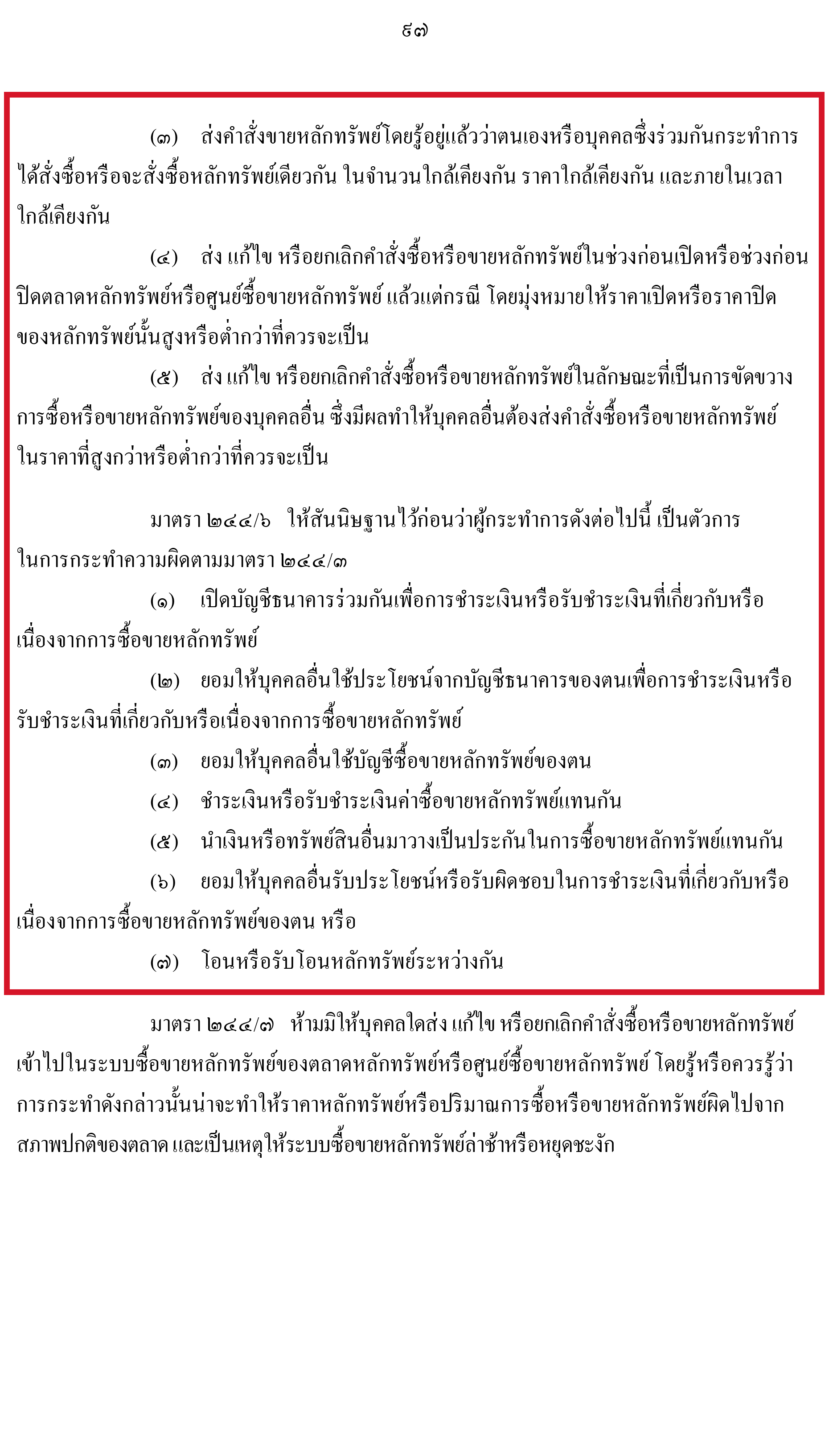 สำหรับมาตรา 244/3 ,มาตรา 244/4 ,มาตรา 244/5 และมาตรา 244/6 แห่ง พ.ร.บ.หลักทรัพย์และตลาดหลักทรัพย์ฯ เป็นบทบัญญัติว่าด้วยข้อห้ามในการส่งคำสั่งซื้อขายหลักทรัพย์ ซึ่งทำให้บุคคลทั่วไปเข้าใจผิดเกี่ยวกับราคาหรือปริมาณการซื้อหรือขายหลักทรัพย์ และการส่งคำสั่งซื้อขายหลักทรัพย์ในลักษณะต่อเนื่องกัน โดยมุ่งหมายให้ราคาหลักทรัพย์หรือปริมาณการซื้อหรือขายหลักทรัพย์นั้น ผิดไปจากสภาพปกติของตลาด (มาตรา 244/3)