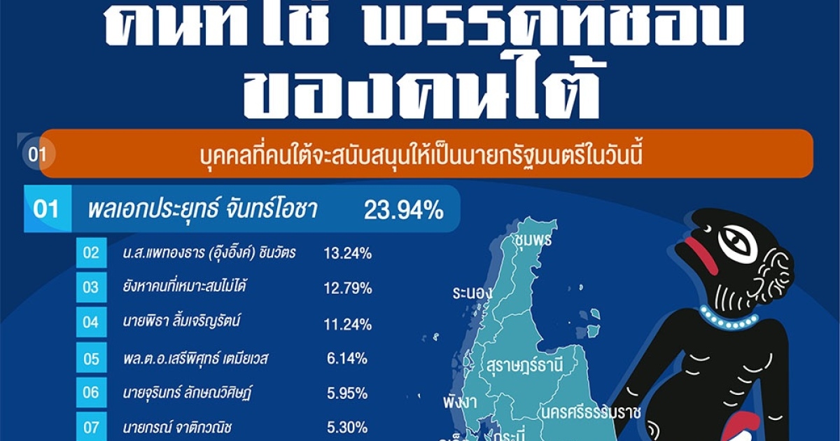 นิด้าเผยผลบุคคลที่คนใต้จะสนับสนุนให้เป็นนายกรัฐมนตรีในวันนี้ พบว่า ร้อยละ 23.94 เป็นพลเอกประยุทธ์ ร้อยละ 13.24 เป็นอุ๊งอิ๊งค์ พรรคเพื่อไทย อีกส่วนระบุว่า ยังหาคนที่เหมาะสมไม่ได้
