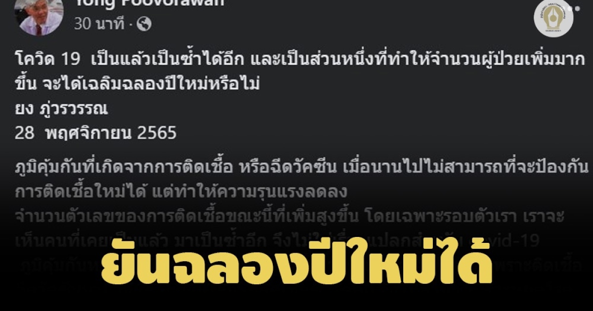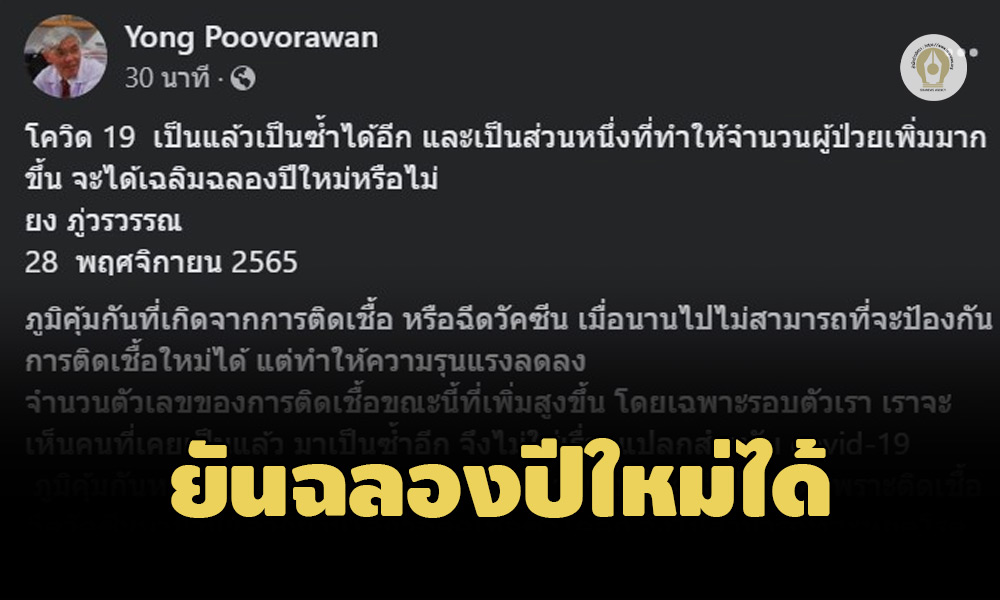 สำนักข่าวอิศรา (www.isranews.org) รายงานว่า เมื่อวันที่ 28 พ.ย. 2565 ศ.นพ.ยง ภู่วรวรรณ หัวหน้าศูนย์เชี่ยวชาญเฉพาะทางด้านไวรัสวิทยา คลินิกภาควิชากุมารเวชศาสตร์ คณะแพทยศาสตร์ จุฬาลงกรณ์มหาวิทยาลัย โพสต์เฟซบุ๊ก Yong Poovorawan ในหัวข้อ 'โควิด 19 เป็นแล้วเป็นซ้ำได้อีก และเป็นส่วนหนึ่งที่ทำให้จำนวนผู้ป่วยเพิ่มมากขึ้น จะได้เฉลิมฉลองปีใหม่หรือไม่' ระบุว่า ภูมิคุ้มกันที่เกิดจากการติดเชื้อ หรือฉีดวัคซีน เมื่อนานไปไม่สามารถที่จะป้องกันการติดเชื้อใหม่ได้ แต่ทำให้ความรุนแรงลดลง
