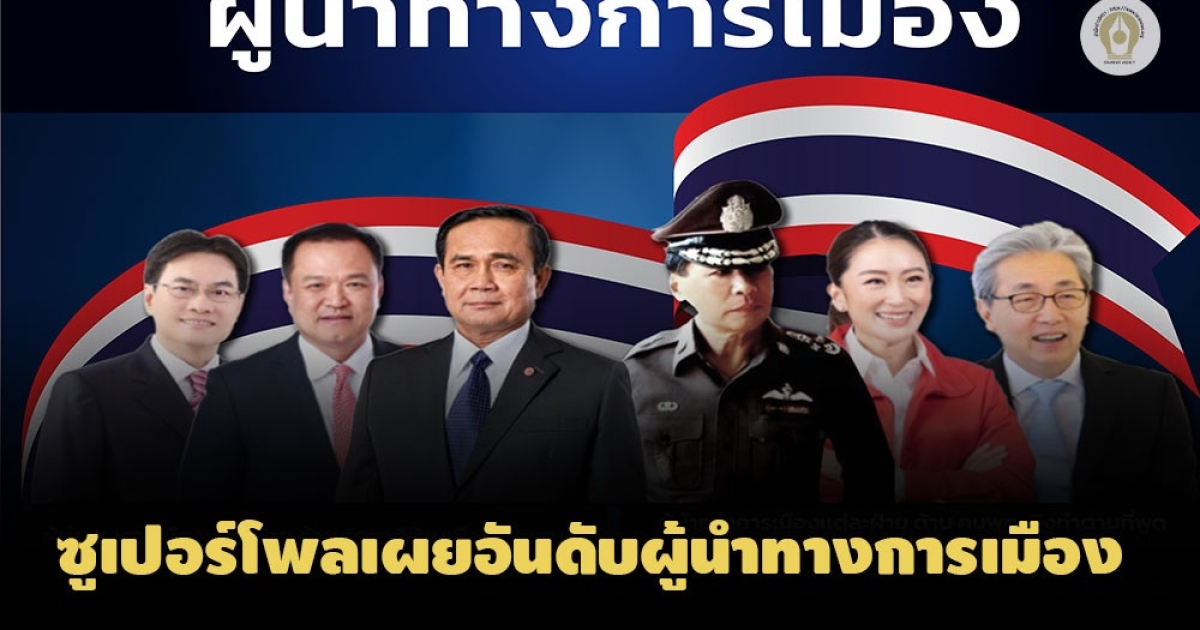 ซูเปอร์โพลเผยผู้นำทางการเมืองอันดับ 1 แต่ละด้าน 'ประยุทธ์' เป็นผู้นำด้านรักชาติ บ้านเมือง เป็นคนดี 'อนุทิน' เป็นคนพูดจริง ทำตามที่พูด 'จุรินทร์' ช่วยเกษตรกรและการค้าระหว่างประเทศ