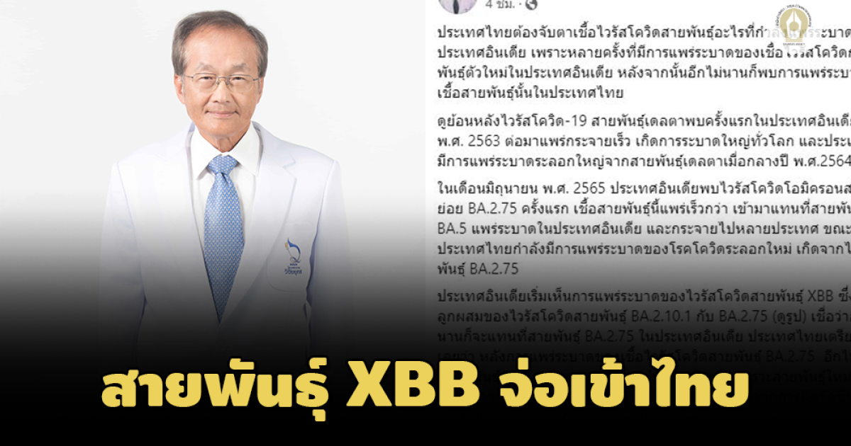 นพ.มนูญ ลีเชวงวงศ์ เตือนสายพันธุ์โควิด XBB หลังระบาดในอินเดีย คาดจะเข้าไทยในอีกไม่ช้า ชี้สายพันธุ์ใหม่นี้ติดง่ายกว่า-หลบภูมิคุ้มกัน-ติดเชื้อธรรมชาติได้ดีกว่าสายพันธุ์เดิม