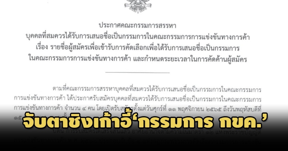ตามที่คณะกรรมการสรรหาบุคคลที่สมควรได้รับการเสนอชื่อเป็นกรรมการในคณะกรรมการการแข่งขันทางการค้า ได้ประกาศรับสมัครบุคคลที่สมควรได้รับการเสนอชื่อเป็นกรรมการในคณะกรรมการการแข่งขันทางการค้า จำนวน 4 คน โดยเปิดรับสมัครตั้งแต่วันศุกร์ที่ 11 พ.ย.2565 ถึงวันพฤหัสบดีที่ 15 ธ.ค.2565 นั้น