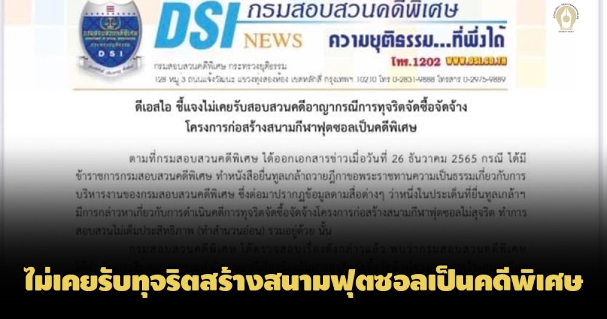 กรมสอบสวนคดีพิเศษ ชี้แจงไม่เคยรับสอบสวนคดีอาญากรณีการทุจริตจัดซื้อจัดจ้าง โครงการก่อสร้างสนามกีฬาฟุตซอลเป็นคดีพิเศษ