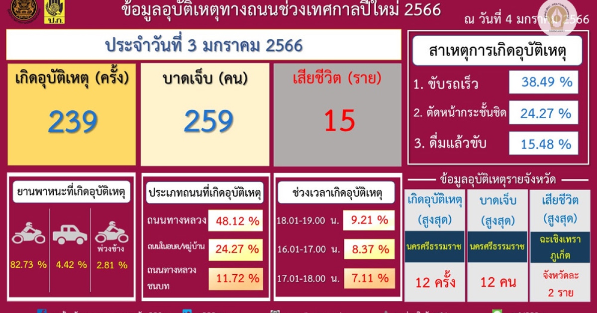 สรุป 7 วันอันตรายปีใหม่ วันที่ 6 เกิดอุบัติเหตุ 239 ครั้ง ดับอีก 15 ราย บาดเจ็บเพิ่ม 259 ราย รวมเสียชีวิต 282 ราย เจ็บ 2,197 ราย สาเหตุขับรถเร็ว-เมาแล้วขับ นครศรีธรรมราชครองแชมป์อุบัติเหตุ-เจ็บสูงสุด