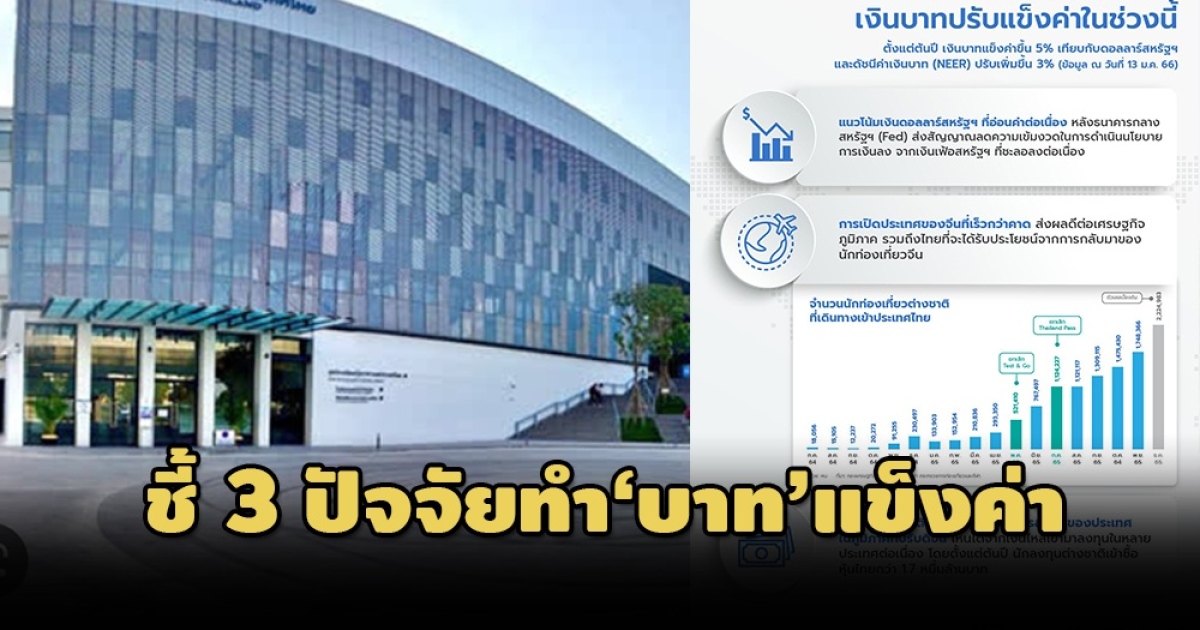 สำนักข่าวอิศรา (www.isranews.org) รายงานว่า เมื่อวันที่ 13 ม.ค.ที่ผ่านมา เพจเฟซบุ๊ก ‘ธนาคารแห่งประเทศไทย’ ซึ่งเป็นเพจทางการของธนาคารแห่งประเทศไทย (ธปท.) ได้เผยแพร่ข้อมูล โดยระบุว่า มี 3 ปัจจัยที่ส่งผลให้ค่าเงินบาทปรับแข็งค่าในช่วงนี้ ได้แก่ 1.แนวโน้มเงินดอลลาร์สหรัฐฯ ที่อ่อนค่าต่อเนื่อง หลังจากธนาคารกลางสหรัฐ (Fed) ส่งสัญญาณลดความเข้มงวดในการดำเนินนโยบายทางการเงินลง จากเงินเฟ้อสหรัฐฯที่ชะลอลงต่อเนื่อง