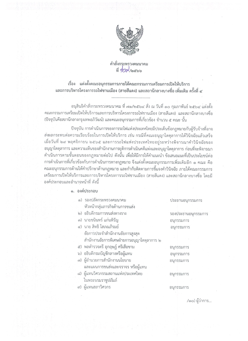 ล่าสุด ได้ลงนามในคำสั่งกระทรวงคมนาคมที่ 127/2566 เรื่อง แต่งตั้งคณะอนุกรรมการภายใต้คณะกรรมการเตรียมการเปิดให้บริการและการบริหารโครงการรถไฟชานเมือง (สายสีแดง) และสถานีกลางบางซื่อ เพิ่มเติม ครั้งที่ 4 สาระสำคัญ ดังนี้
