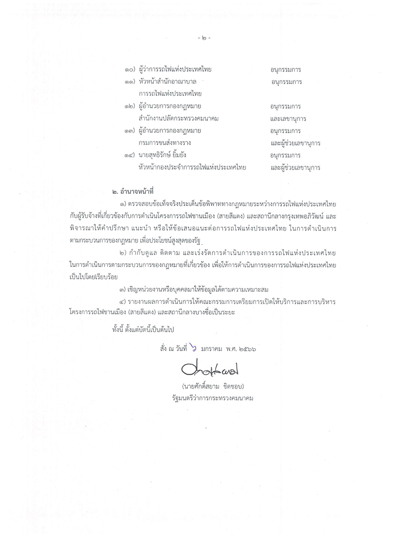 2. กำกับดูแล ติดตาม และเร่งรัดการดำเนินการของการรถไฟแห่งประเทศไทยในการดำเนินการตามกระบวนการของกฎหมายที่เกี่ยวข้อง เพื่อให้การดำเนินการของการรถไฟแห่งประเทศไทยเป็นไปโดยเรียบร้อย