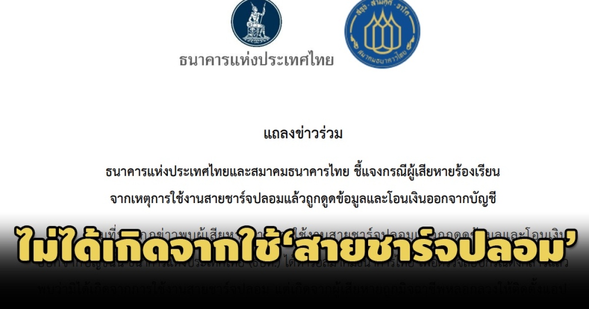 เมื่อวันที่ 18 ม.ค. ธนาคารแห่งประเทศไทย (ธปท.) และสมาคมธนาคารไทย ได้ออกเอกสารแถลงข่าวร่วมชี้แจงกรณีผู้เสียหายร้องเรียนจากเหตุการใช้งานสายชาร์จปลอมแล้วถูกดูดข้อมูลและโอนเงินออกจากบัญชี โดยระบุว่า ตามที่ปรากฎข่าวพบผู้เสียหายจากการใช้งานสายชาร์จปลอมแล้วถูกดูดข้อมูลและโอนเงินออกจากบัญชี นั้น