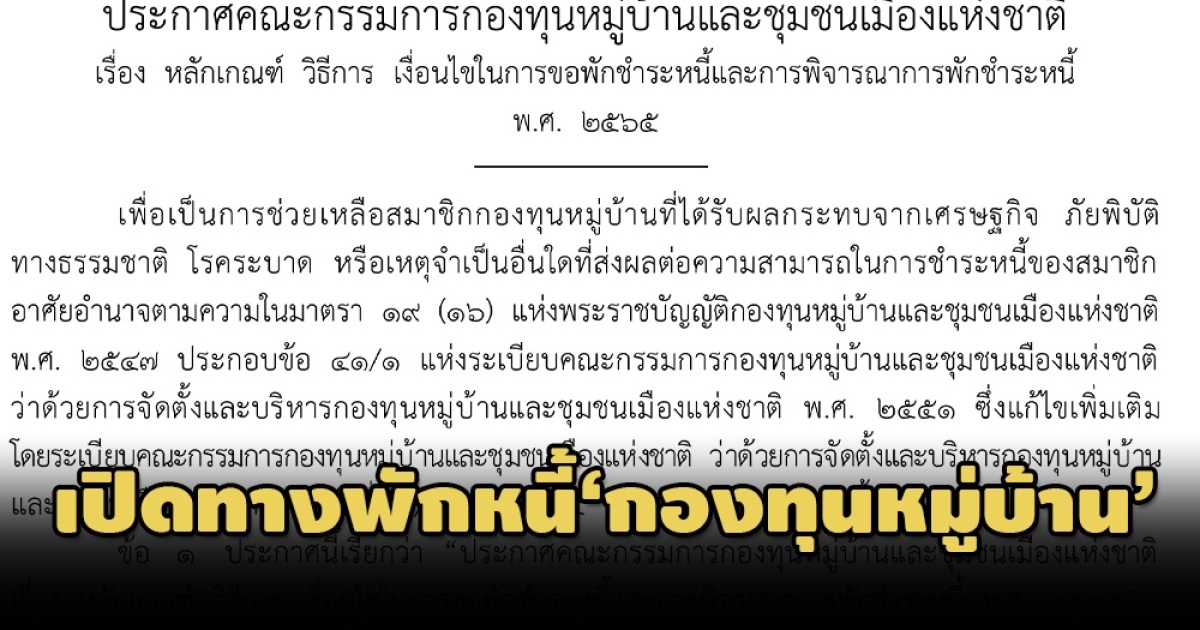 สำนักข่าวอิศรา (www.isranews.org) รายงานว่า เมื่อวันที่ 20 ม.ค.ที่ผ่านมา เว็บไซต์ราชกิจจานุเบกษาเผยแพร่ประกาศคณะกรรมการกองทุนหมู่บ้านและชุมชนเมืองแห่งชาติ เรื่อง หลักเกณฑ์ วิธีการ เงื่อนไขในการขอพักชำระหนี้และการพิจารณาการพักชำระหนี้ พ.ศ.2565 โดยประกาศฯฉบับนี้ กำหนดให้กองทุนหมู่บ้านสามารถพักชำระหนี้ หรือดอกเบี้ย หรือเงินต้นและดอกเบี้ยเกินกว่าที่กำหนดไว้ในสัญญากู้ยืมเงิน ให้กับสมาชิกที่ได้รับผลกระทบจากเศรษฐกิจ ภัยพิบัติทางธรรมชาติ โรคระบาด หรือเหตุจำเป็นอื่นใด ที่ส่งผลกระทบต่อความสามารถในการชำระหนี้ของสมาชิกได้