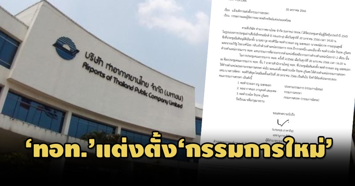 ‘บอร์ด ทอท.’ มีมติแต่งตั้ง ‘พล.ต.อ.มนู เมฆหมอก-พล.ต.ท.จิรภพ ภูริเดช’ เป็น 'ประธาน-กรรมการสรรหาฯ' พร้อมเลือก ‘สราวุธ ทรงศิวิไล’ นั่งประธานบอร์ดอีกวาระ