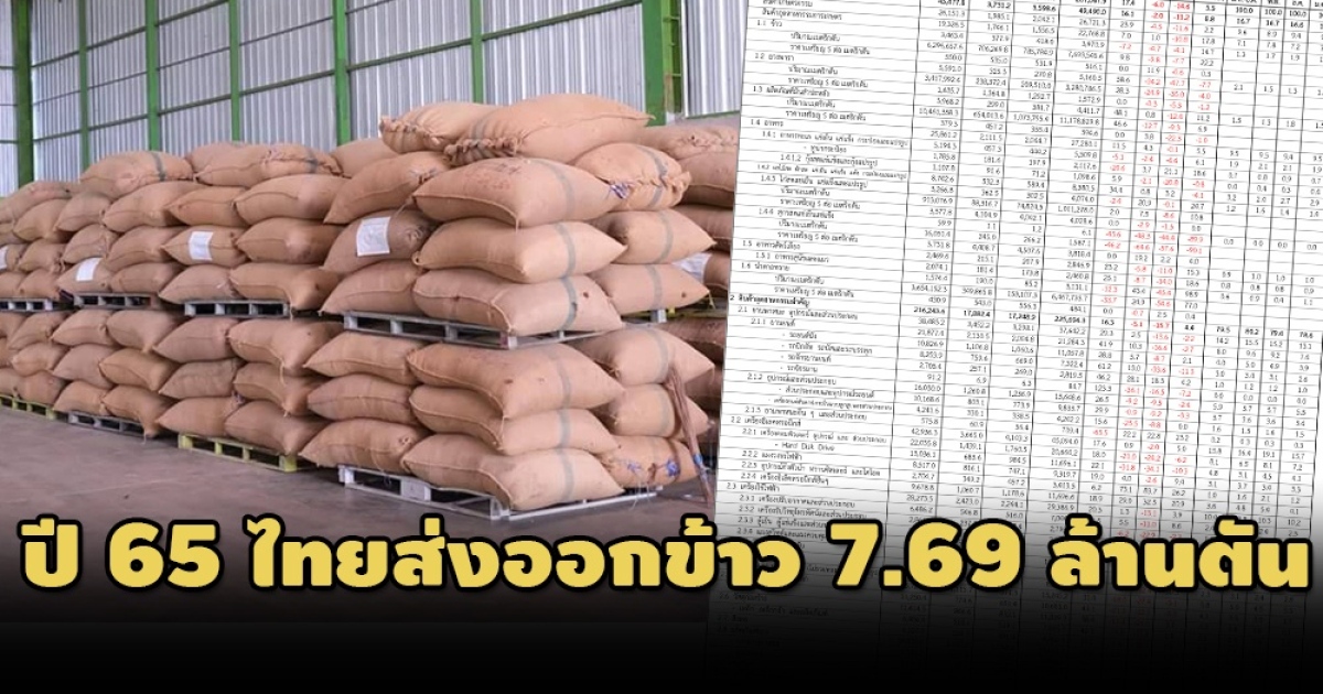 ‘พาณิชย์’ เผยทั้งปี 65 ไทยส่งออกข้าวได้ 7.69 ล้านตัน เติบโต 22.2% จากปีก่อน สร้างรายได้เข้าประเทศกว่า 1.38 แสนล้าน ขณะที่ ‘สมาคมผู้ส่งออกข้าวไทย’ เตรียมแถลงเป้าหมายส่งออกข้าว 66 คาดไม่ต่ำกว่าปี 65 จับตา ‘บาทแข็ง’