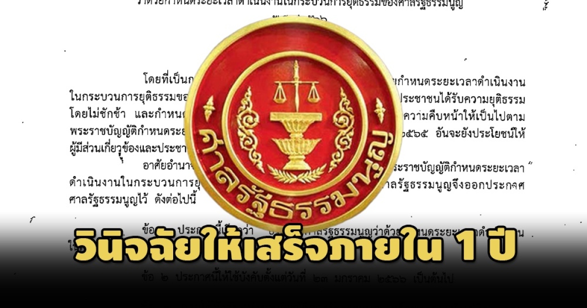‘ประธานศาลรัฐธรรมนูญ’ ลงนามประกาศฯกำหนดระยะเวลาพิจารณาคดีใน ‘ศาลรัฐธรรมนูญ’ ต้องวินิจฉัยให้แล้วเสร็จภายใน 1 ปีนับตั้งวันรับคำร้อง หากไม่แล้วเสร็จให้ขยายเวลาได้ แต่ต้องกำหนดเวลาที่คาดว่าจะแล้วเสร็จ 'โดยเร็วที่สุด'