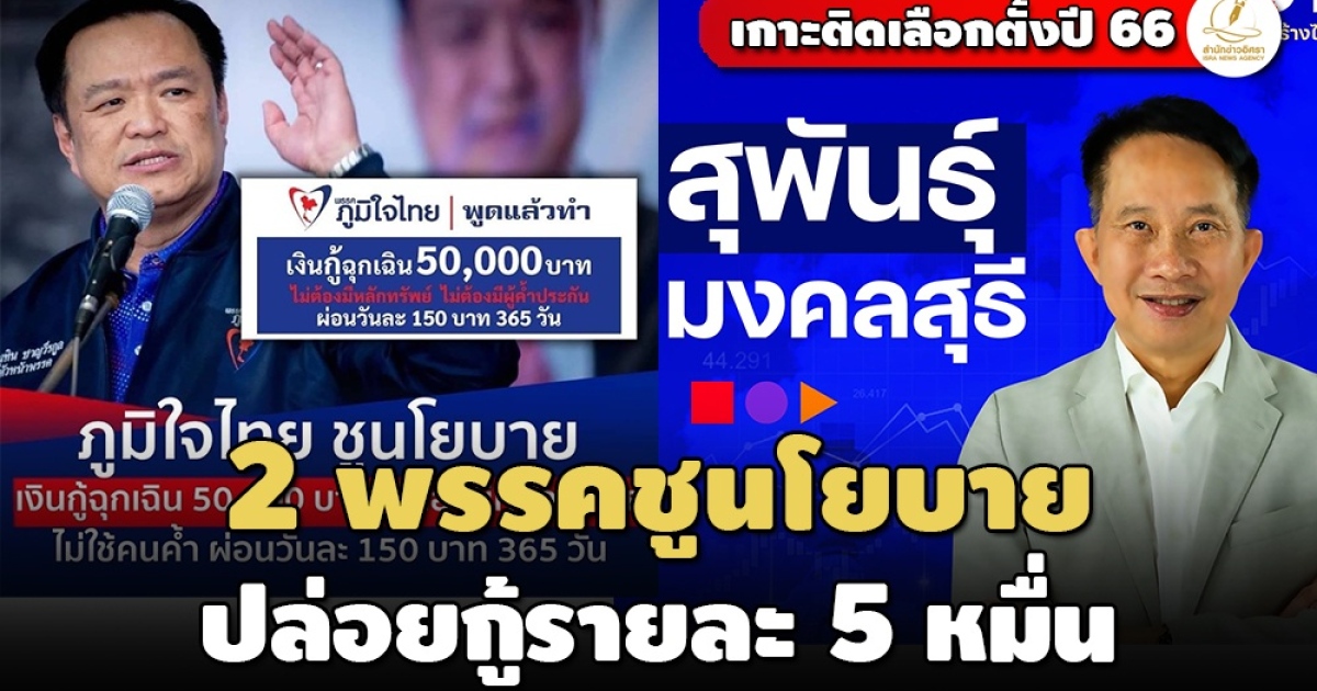 ‘ไทยสร้างไทย’ ประกาศนโยบายแก้หนี้สินครัวเรือน ตั้ง ‘กองทุนเครดิตประชาชน’ ปล่อยกู้รายละ 5 หมื่น ดอกเบี้ย 1% ใช้เป็นทุนหมุนเวียน-จ่ายหนี้นอกระบบ ขณะที่ ‘ภูมิใจไทย’ เสนอวงเงินกู้ฉุกเฉินคนละ 5 หมื่น ให้คนไทยทุกคนที่อายุ 20 ปีขึ้นไป