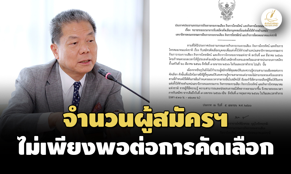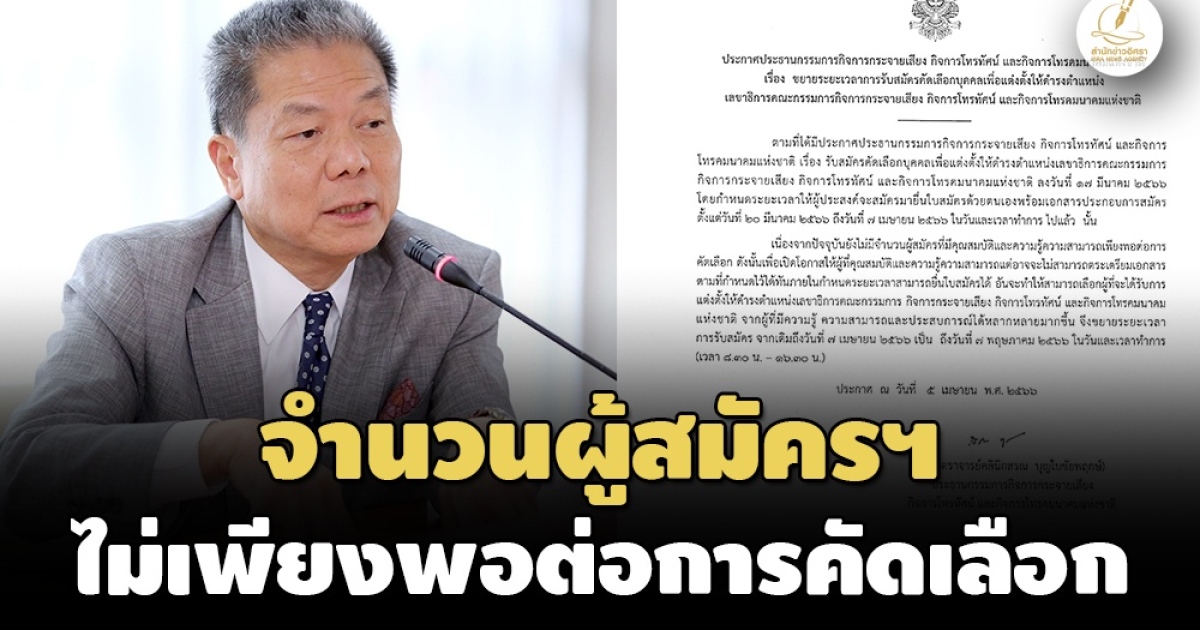 ‘ประธาน กสทช.’ เซ็นประกาศฯขยายเวลาเปิดยื่นใบสมัคร ‘เลขาธิการ กสทช.’ ออกไปอีก 1 เดือน เป็นถึงวันที่ 7 พ.ค.66 หลังมีจำนวนผู้ยื่นใบสมัครไม่เพียงพอต่อการคัดเลือก ขณะที่ล่าสุดมีผู้ยื่นใบสมัครแล้ว 7 ราย