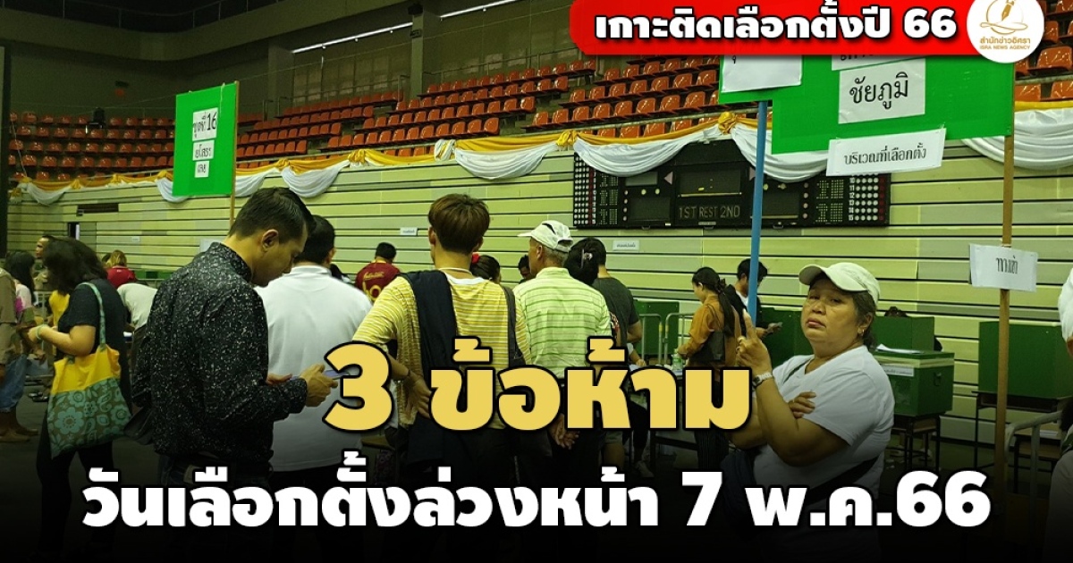 กกต.ออกข่าวเตือนผู้ไปใช้สิทธิ์เลือกตั้งล่วงหน้า วันพรุ่งนี้ (7 พ.ค. 66) ห้ามขาย-ดื่มสุราและเครื่องดื่มที่มีแอลกอฮอล์ตั้งแต่ 18.00 น. วันนี้ (6 พ.ค. 66) ถึง 18.00 น.ของวันที่ 7 พ.ค., ผู้สมัครห้ามจัดรถพาคนไปลงคะแนน และห้ามขัดขวางไม่ให้คนไปเลือกตั้ง