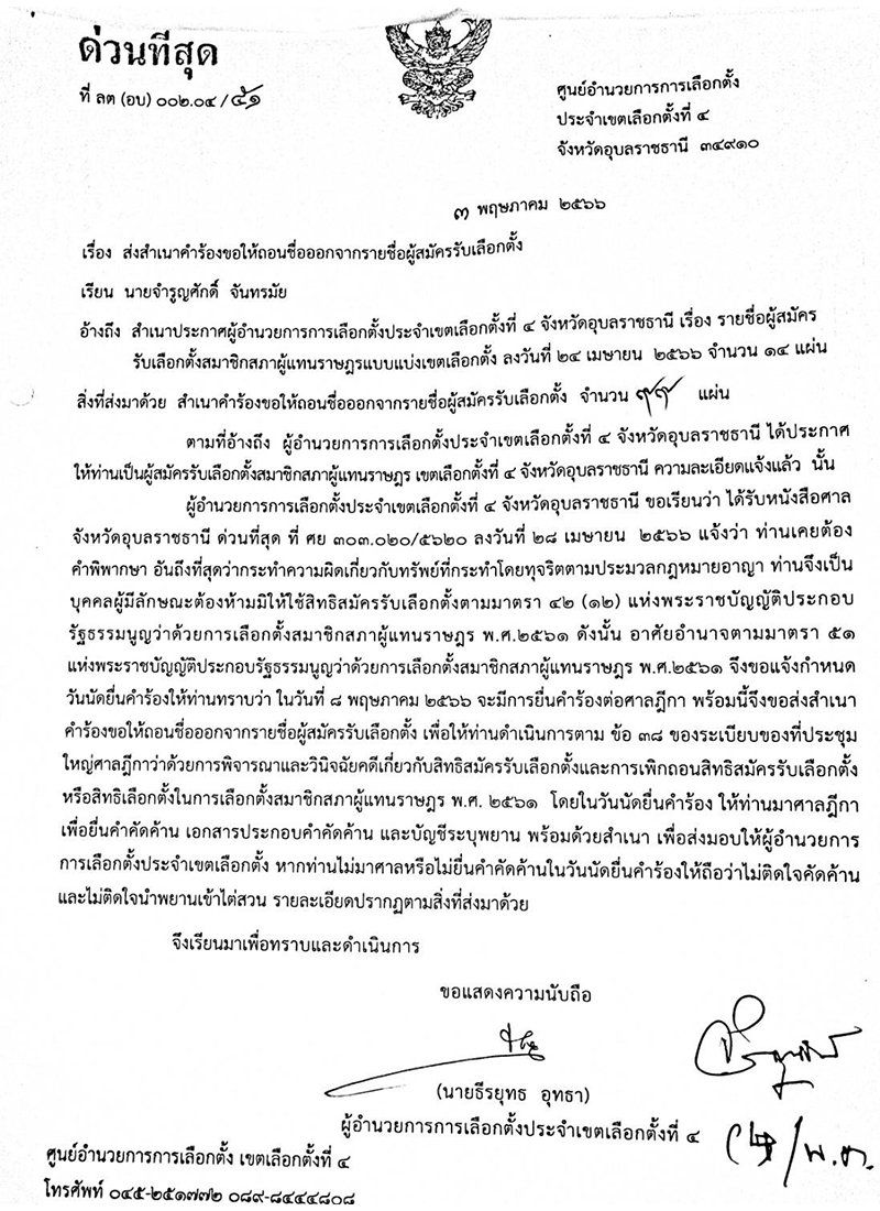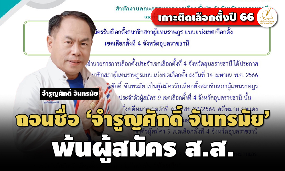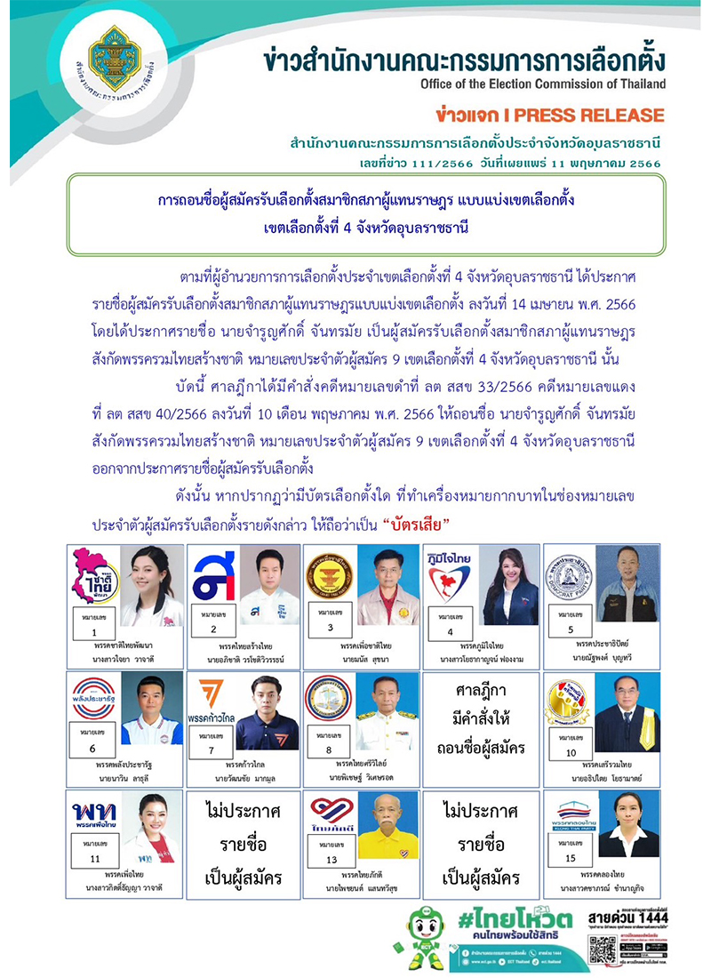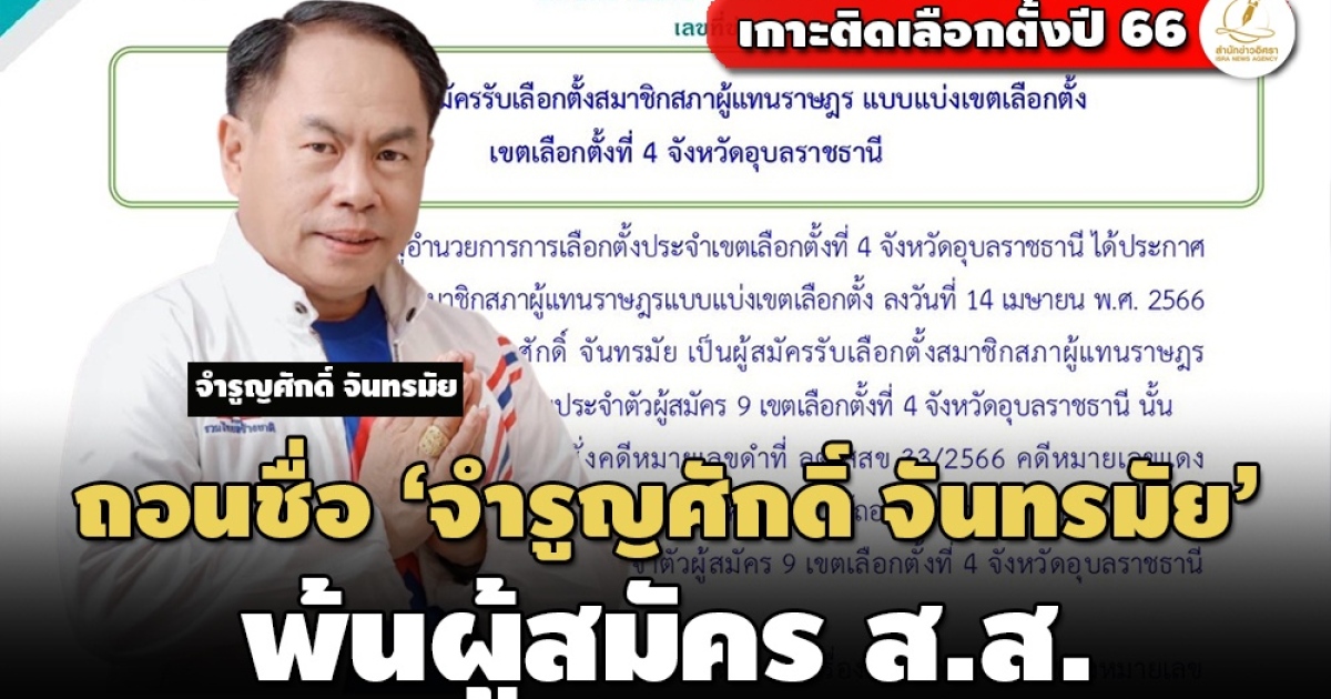 บัดนี้ ศาลฎีกาได้มีคำสั่งคดีหมายเลขดำที่ ลต สสข 33/2566 คดีหมายเลขแดงที่ ลต สสข 40/2566 ลงวันที่ 10 พ.ค. 2566 ให้ถอนชื่อ นายจำรูญศักดิ์ จันทรมัย สังกัดพรรครวมไทยสร้างชาติ หมายเลขประจำตัวผู้สมัคร 9 เขตเลือกตั้งที่ 4 จ.อุบลราชธานี ออกจากประกาศรายชื่อผู้สมัครรับเลือกตั้ง
