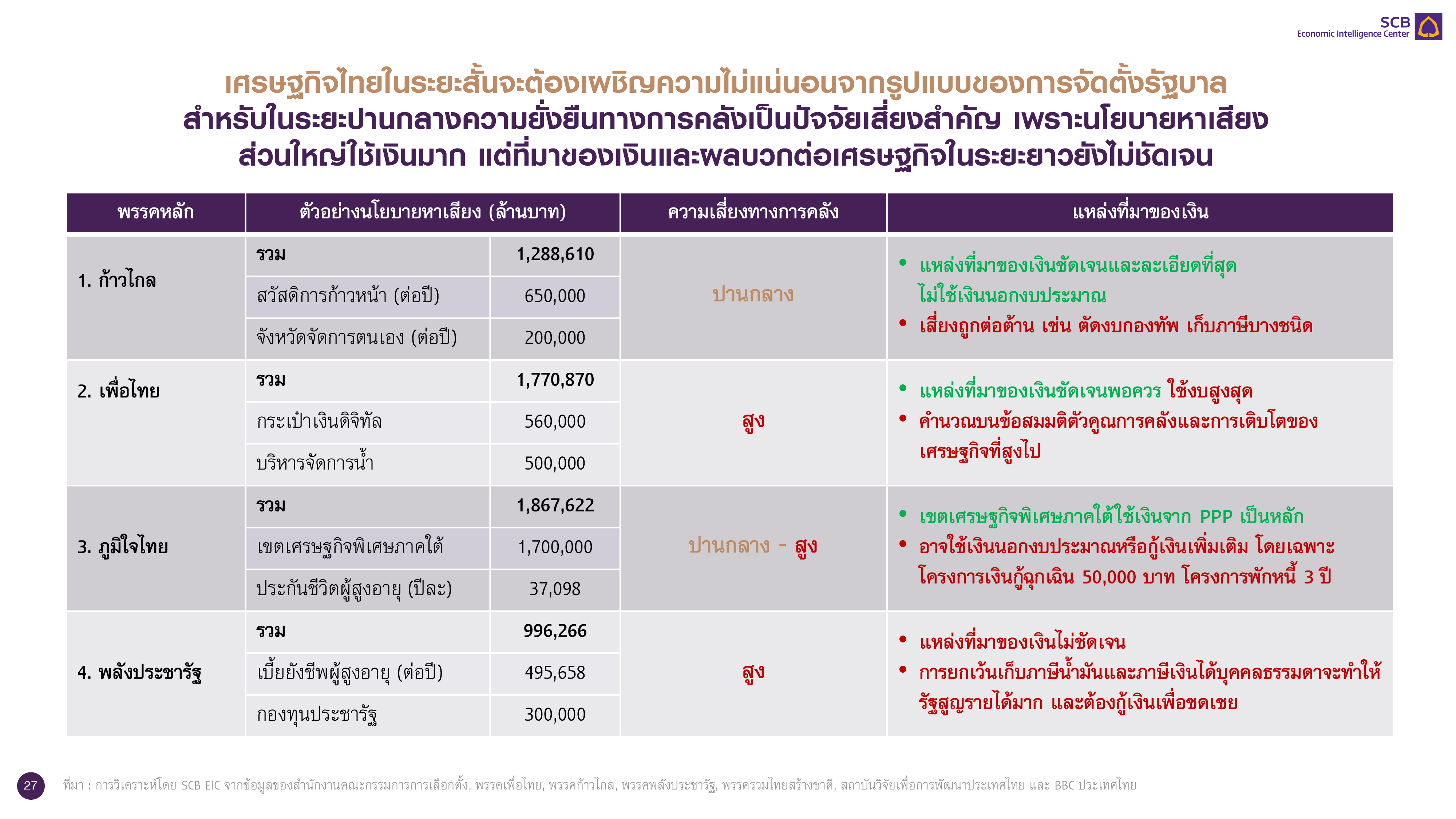 SCB EIC ระบุด้วยว่า เศรษฐกิจไทยในระยะสั้นจะต้องเผชิญความไม่แน่นอนจากรูปแบบของการจัดตั้งรัฐบาล สำหรับในระยะปานกลางความยั่งยืนทางการคลังเป็นปัจจัยเสี่ยงสำคัญ เพราะนโยบายหาเสียงส่วนใหญ่ใช้เงินมากและมีความเสี่ยงทางการคลังในระดับสูง เช่น กระเป๋าเงินดิจิทัล 5.6 แสนล้าน และการบริหารจัดการน้ำ 5 แสนล้านบาท เป็นต้น แต่ที่มาของเงินและผลบวกต่อเศรษฐกิจในระยะยาวยังไม่ชัดเจน