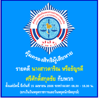 ด้วยคณะกรรมการธุรกรรมได้มีมติในการประชุมครั้งที่ 5/2566 เมื่อวันที่ 2 พ.ค. 2566 ให้ยึดและอายัดทรัพย์สินที่เกี่ยวกับการกระทำความผิดไว้ชั่วคราว ราย นางสาวดาริณ หรือธัญรดี ศรีศักดิ์สกุลชัย กับพวก มีกำหนดไม่เกิน 90 วัน (เก้าสิบวัน) นับตั้งแต่วันที่คณะกรรมการธุรกรรม มีมติ