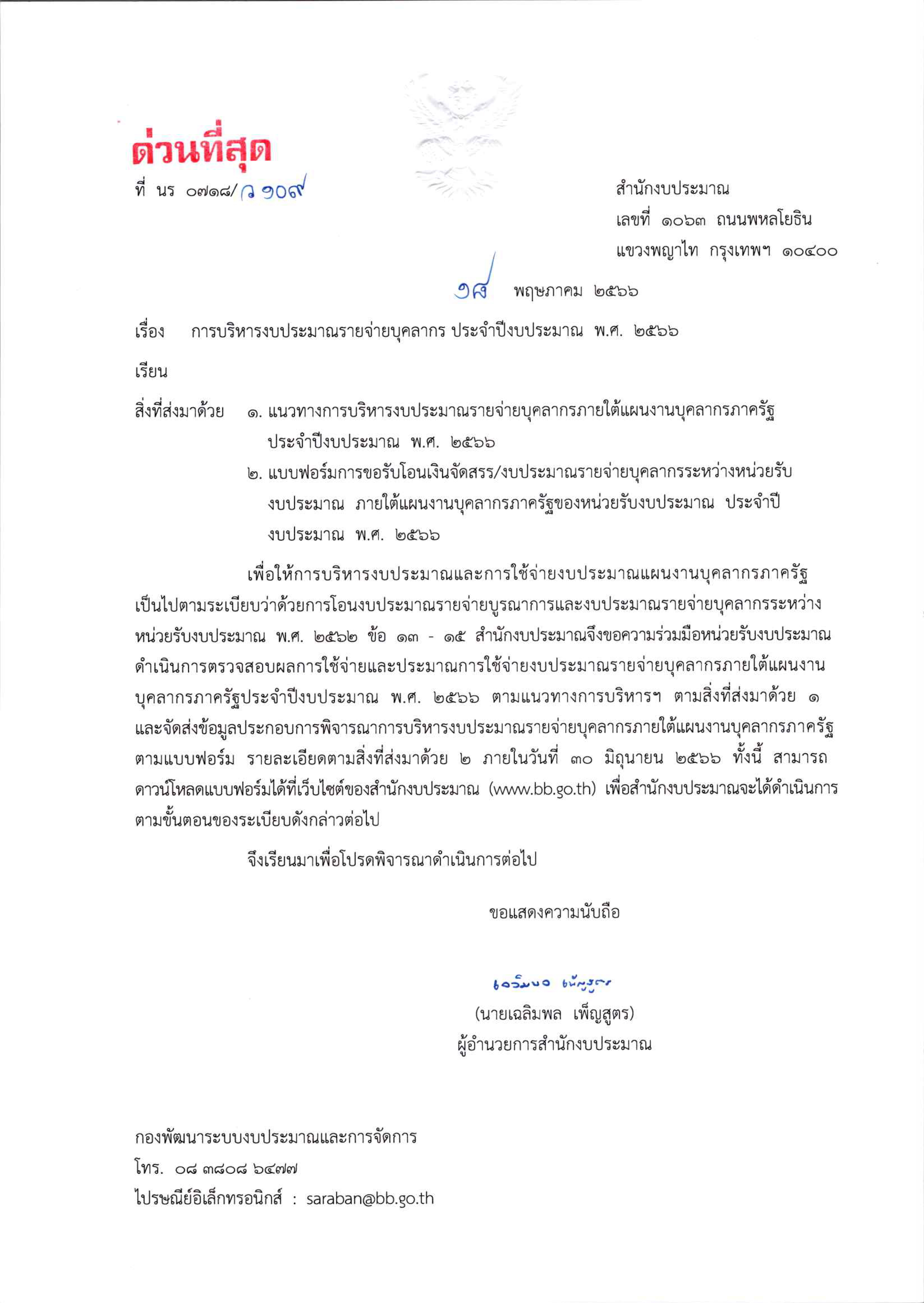 ทั้งนี้ ให้หน่วยรับงบประมาณตรวจสอบและแสดงจำนวนเงินตามแบบฟอร์มที่สำนักงบประมาณกำหนด โดยไม่รวมงบประมาณที่เป็นเงินอุดหนุนทั่วไป ส่งสำนักงบประมาณภายในวันที่ 30 มิถุนายน 2566 เพื่อสำนักงบประมาณจะได้ประมวลผลในภาพรวม และแจ้งผลการพิจารณาการโอนงบประมาณรายจ่ายบุคลากรให้หน่วยรับงบประมาณดำเนินการตามระเบียบที่เกี่ยวข้องต่อไป