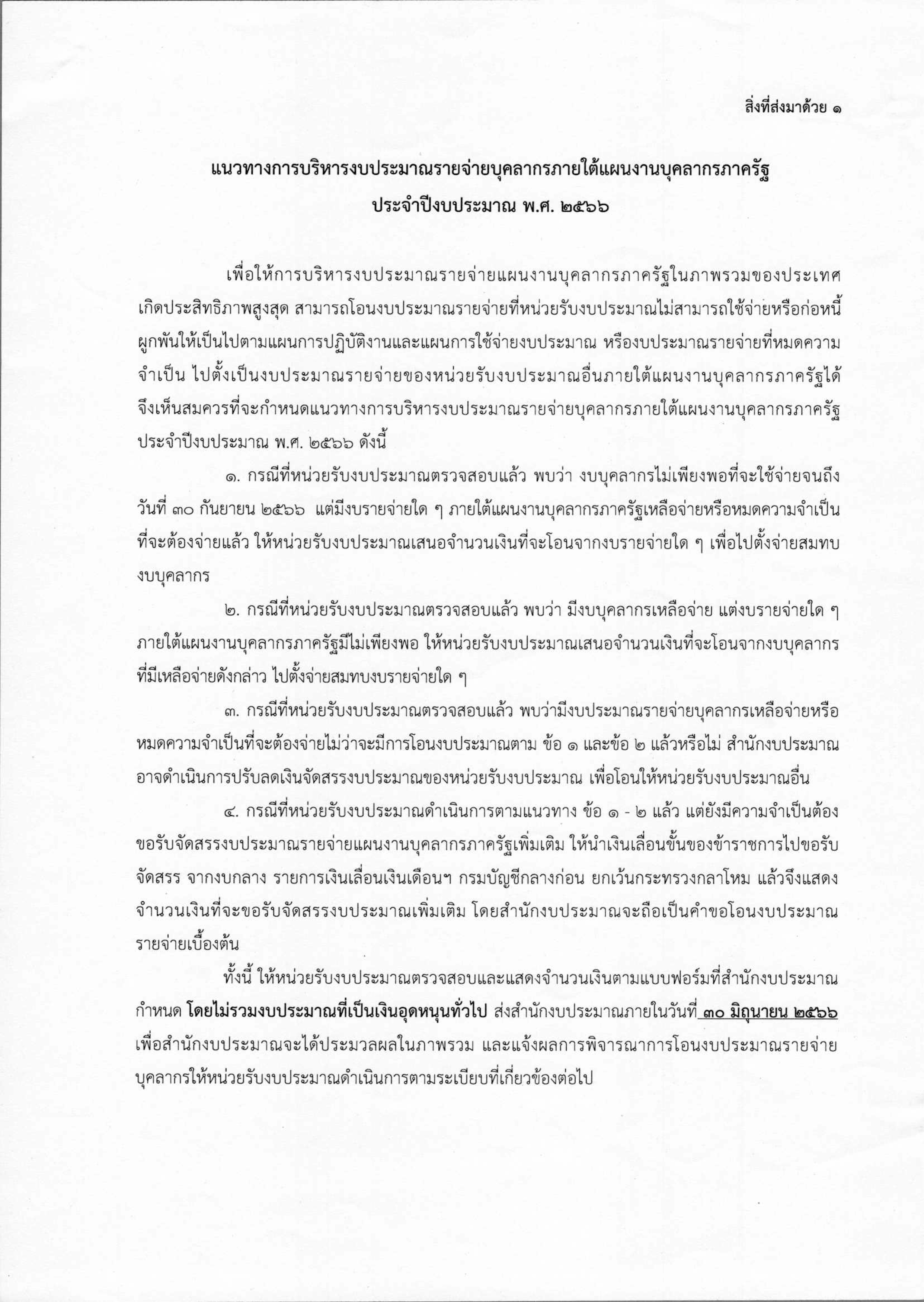 สำหรับแนวทางการบริหารงบประมาณรายจ่ายบุคลากรภายใต้แผนงานบุคลากรภาครัฐ ประจำปีงบประมาณ พ.ศ.2566 ดังกล่าว มีเนื้อหาว่า เพื่อให้การบริหารงบประมาณรายจ่ายแผนงานบุคลากรภาครัฐในภาพรวมของประเทศเกิดประสิทธิภาพสูงสุด สามารถโอนงบประมาณรายจ่ายที่หน่วยรับงบประมาณ ไม่สามารถใช้จ่ายหรือก่อหนี้ผูกพันให้เป็นไปตามแผนการปฏิบัติงานและแผนการใช้จ่ายงบประมาณ หรืองบประมาณรายจ่ายที่หมดความจำเป็น ไปตั้งเป็นงบประมาณรายจ่ายของหน่วยรับงบประมาณอื่นภายใต้แผนงานบุคลากรภาครัฐได้