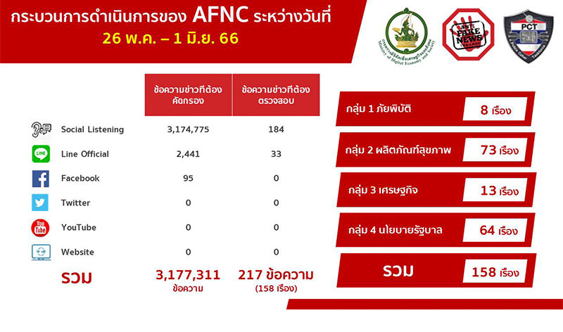 สำนักข่าวอิศรา (www.isranews.org) รายงานว่า วันที่ 3 มิถุนายน 2566 นายเวทางค์ พ่วงทรัพย์ รองปลัดกระทรวงดิจิทัลเพื่อเศรษฐกิจและสังคม (ดีอีเอส) ในฐานะโฆษกกระทรวงฝ่ายข้าราชการประจำ กล่าวว่า ผลการมอนิเตอร์และรับแจ้งข่าวปลอมของศูนย์ต่อต้านข่าวปลอม ระหว่างวันที่ 26 พฤษภาคม-1 มิถุนายน 2566 พบข้อความที่เข้ามาทั้งหมด 3,177,311 ข้อความ