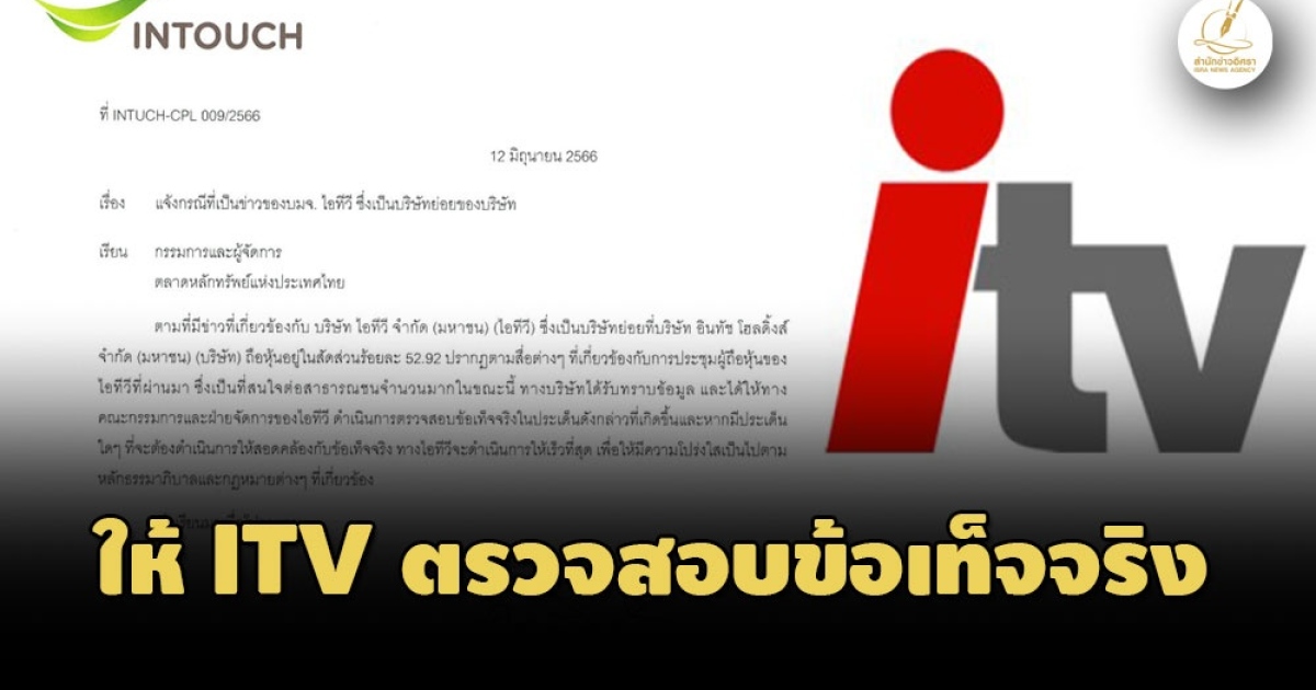'บริษัทอินทัช โฮลดิ้งส์' เผยให้ 'บริษัท ไอทีวี' ดำเนินการตรวจสอบข้อเท็จจริง กรณีคลิปข่าวบันทึกการประชุมผู้ถือหุ้น ITV ไม่ตรงกับเอกสารบันทึกการประชุม
