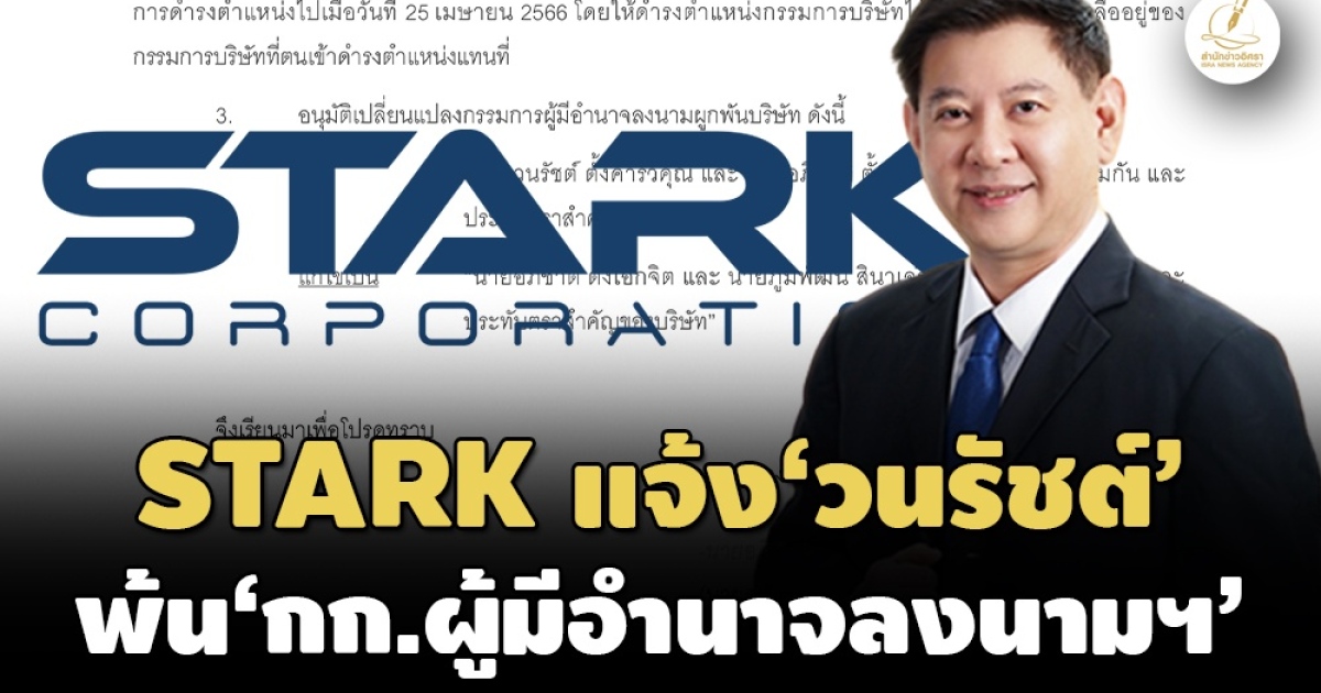 STARK แจ้ง ‘วนรัชต์ ตั้งคารวคุณ’ พ้นตำแหน่ง ‘กรรมการผู้มีอำนาจลงนามผูกพันบริษัท’ พร้อมตั้ง ‘สมชัย สวัสดีผล’ นั่งเก้าอี้ประธาน แทน ‘พ.ต.ท.ปกรณ์ สุชีวกุล’ ที่ลาออก