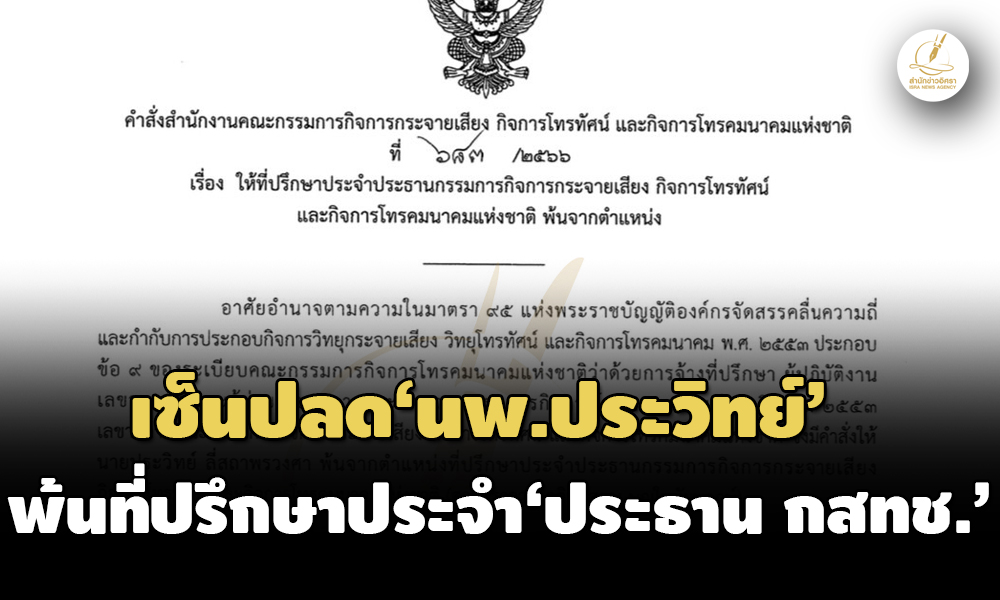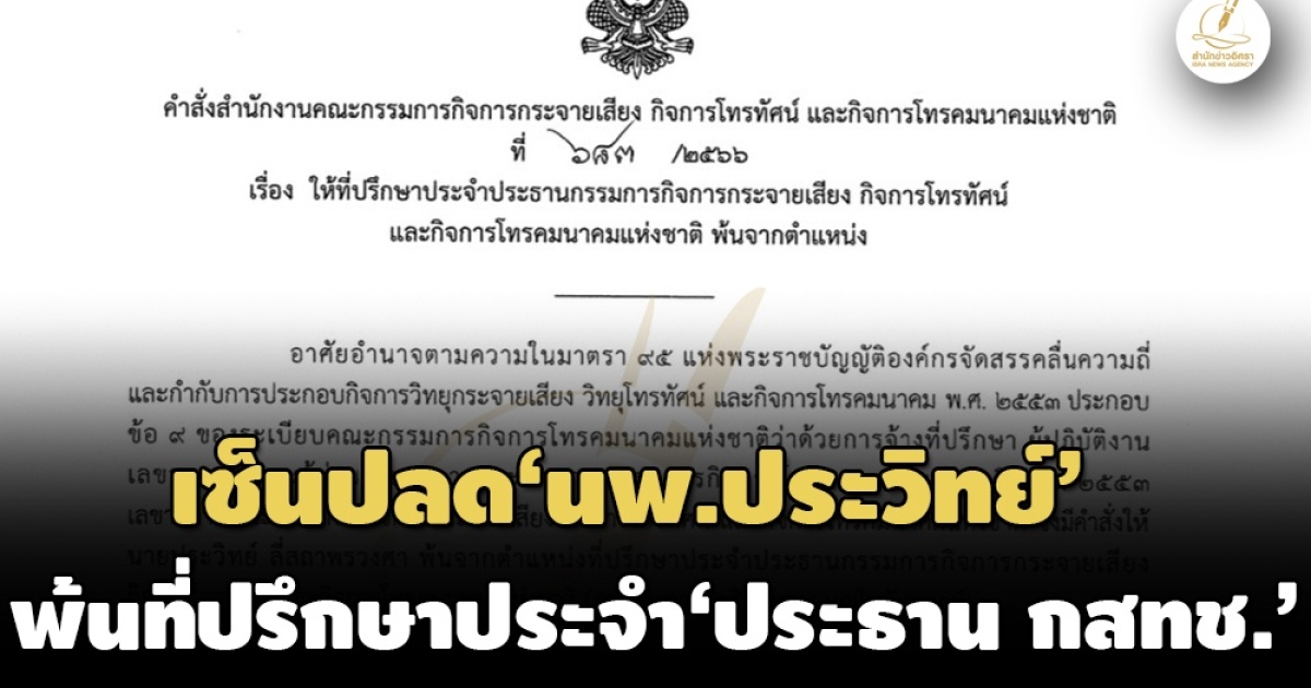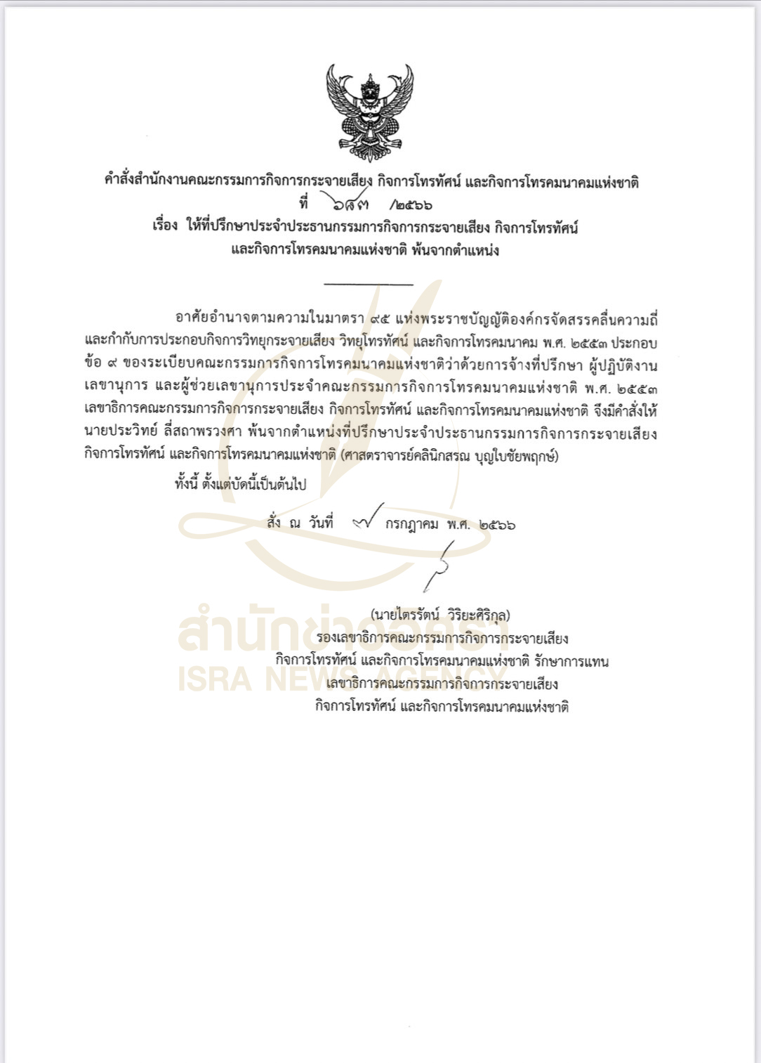 สำนักข่าวอิศรา (www.isranews.org) รายงานว่า เมื่อวันที่ 7 ก.ค. นายไตรรัตน์ วิริยะศิริกุล รองเลขาธิการคณะกรรมการกิจการกระจายเสียง กิจการโทรทัศน์ และกิจการโทรคมนาคมแห่งชาติ (กสทช.) รักษาการแทนเลขาธิการ กสทช. ลงนามคำสั่งสำนักงาน กสทช. ที่ 683/2566 เรื่อง ให้ที่ปรึกษาประจำประธานกรรมการกิจการกระจายเสียง กิจการโทรทัศน์และกิจการโทรคมนาคมแห่งชาติ พ้นจากตำแหน่ง โดยมีเนื้อหาว่า