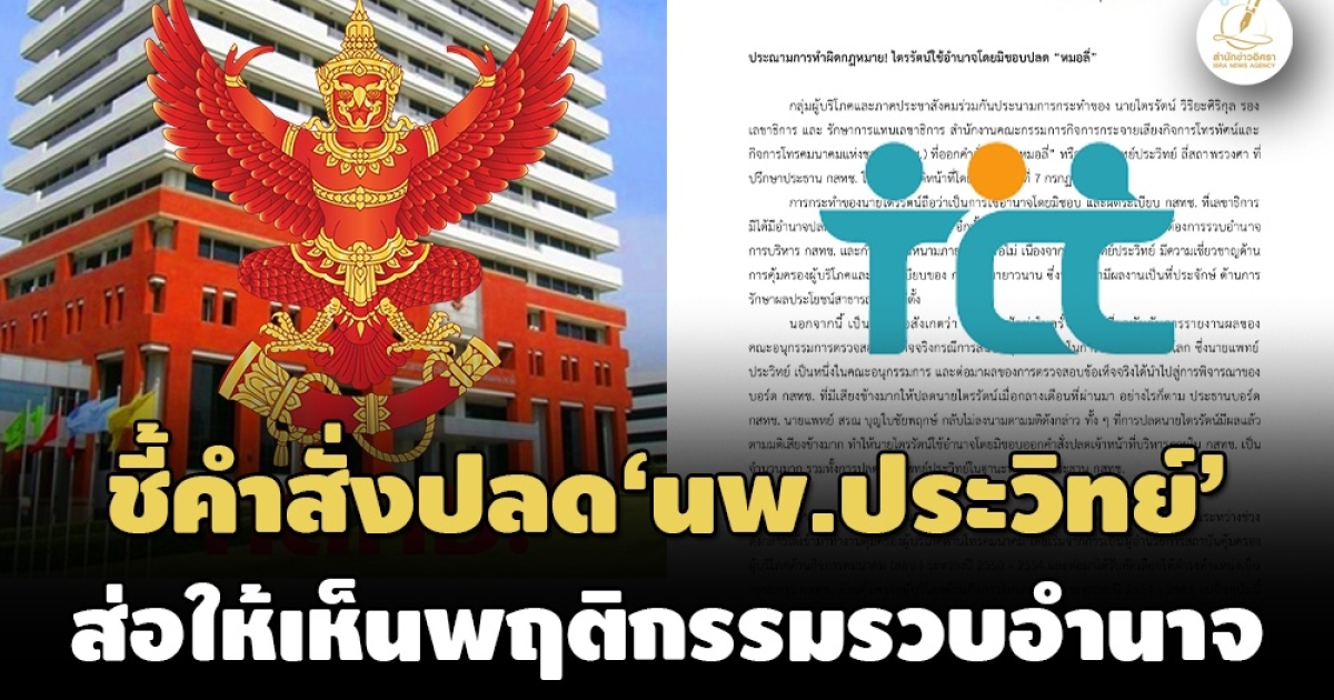 ‘สภาผู้บริโภค’ แพร่เอกสารข่าว ชี้ ‘รักษาการเลขาธิการ กสทช.’ เซ็นคำสั่งปลด ‘นพ.ประวิทย์ ลี่สถาพรวงศา’ พ้นที่ปรึกษาประจำ ‘ประธาน กสทช.’ ส่อให้เห็นพฤติกรรมรวบอำนาจ-ขจัดเสี้ยนหนาม