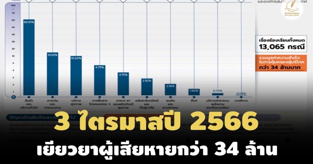 สำนักข่าวอิศรา (www.isranews.org) รายงานว่า วันที่ 18 ก.ค. 2566 สภาผู้บริโภค เผยภาพรวมปัญหาผู้บริโภคทั่วประเทศ ในปีงบประมาณ 2566 3 ไตรมาส โดยเป็นการรวบรวมข้อมูลปัญหาผู้บริโภคจากทั้งสำนักงานสภาผู้บริโภค หน่วยงานประจำจังหวัด 15 จังหวัด และองค์กรสมาชิกทั่วประเทศ พบว่าตั้งแต่วันที่ 1 ต.ค. 2565 – 30 มิ.ย. 2566 สภาผู้บริโภคได้รับเรื่องร้องเรียนทั้งหมด 13,065 กรณี ซึ่งคิดเป็นมูลค่าความสำเร็จในการคุ้มครองผู้บริโภค 34,825,702.45 บาท