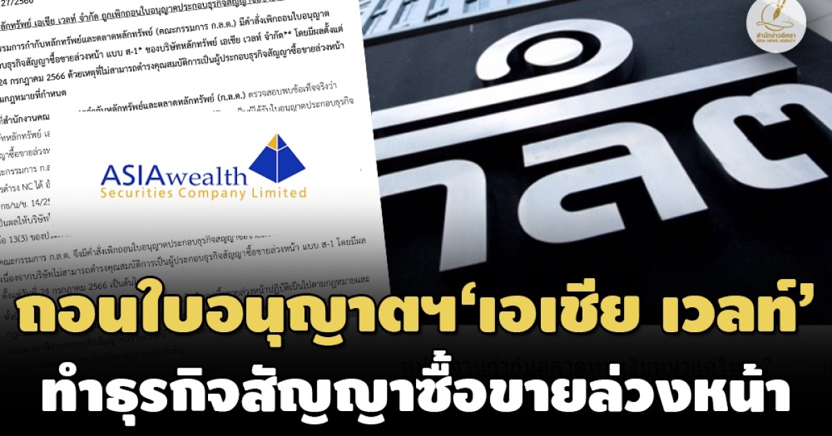 เมื่อวันที่ 24 ก.ค. คณะกรรมการกำกับหลักทรัพย์และตลาดหลักทรัพย์ (คณะกรรมการ ก.ล.ต.) มีคำสั่งเพิกถอนใบอนุญาตประกอบธุรกิจสัญญาซื้อขายล่วงหน้า แบบ ส-1 ของบริษัทหลักทรัพย์ เอเชีย เวลท์ จำกัด โดยมีผลตั้งแต่วันที่ 24 ก.ค.2566 ด้วยเหตุที่ไม่สามารถดำรงคุณสมบัติการเป็นผู้ประกอบธุรกิจสัญญาซื้อขายล่วงหน้าได้ตามกฎหมายที่กำหนด