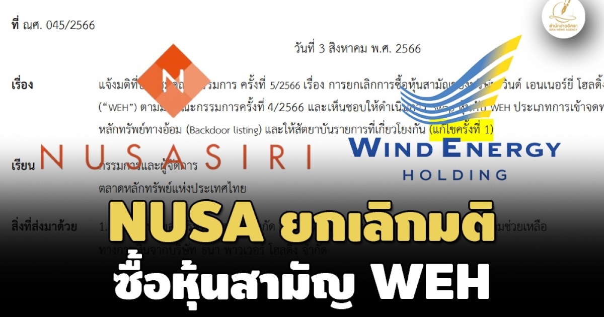 NUSA แจ้งตลาดหลักทรัพย์ฯ ยกเลิกมติบอร์ดเข้าซื้อหุ้นสามัญ WEH แล้ว แต่จะใช้วิธีการ Swap หุ้น นำบริษัท WEH เข้าจดทะเบียนในตลาดหลักทรัพย์ฯ ‘ทางอ้อม’ ตามหลักเกณฑ์ ก.ล.ต. แทน