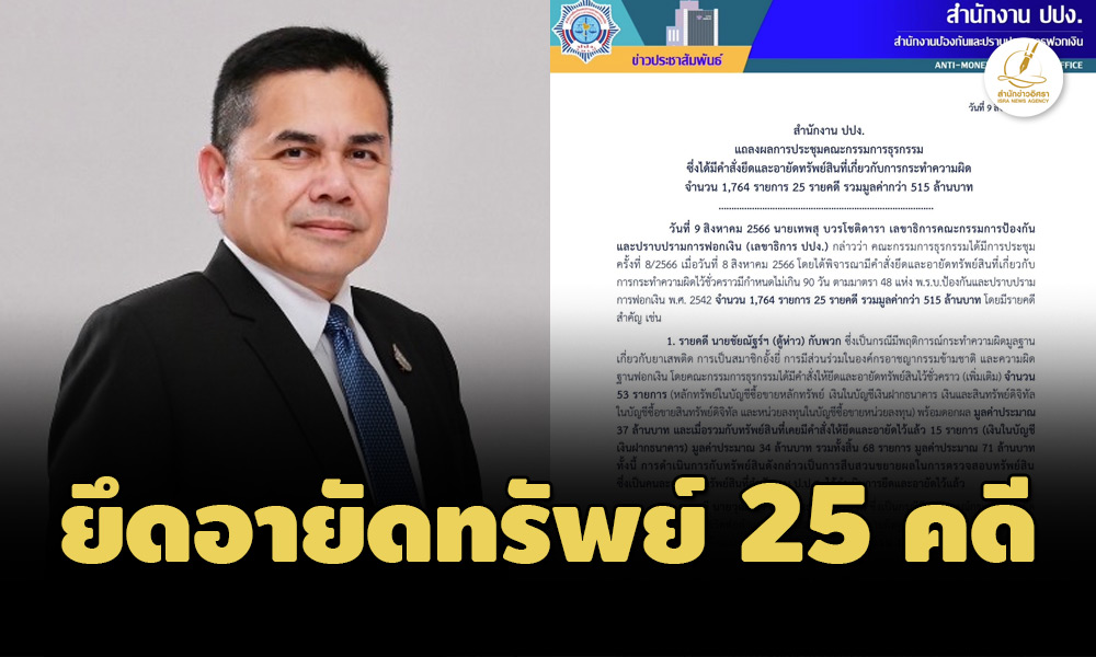 ปปง. มีคำสั่งยึดและอายัทรัพย์สินที่เกี่ยวกับการกระทำความผิด จำนวน 1,764 รายการ 25 รายคดี รวมมูลค่ากว่า 515 ล้านบาท