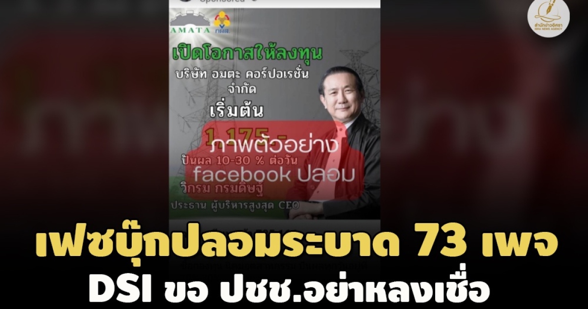 DSI แจ้งเตือน อย่าหลงเชื่อเพจเฟซบุ๊กปลอม แอบอ้างชื่อ บริษัท อมตะ คอร์เปอเรชั่น จำกัด (มหาชน) หลอกให้ลงทุน ระบาดถึง 73 เพจ เบื้องต้นประสารฝ่ายกฎหมายบริษัทช่วยแจ้งเตือน ให้ผู้ว่าฯชลบุรีหาแนวทางป้องกันแล้ว