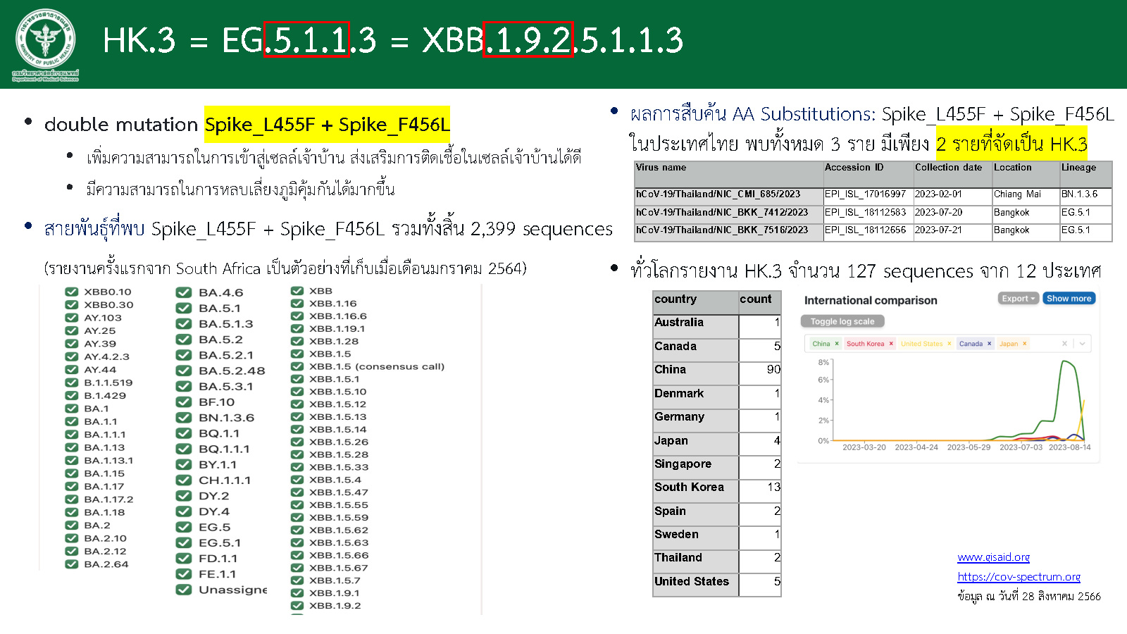 นพ.ศุภกิจ กล่าวว่า สำหรับสายพันธุ์ HK.3 (XBB.1.9.2.5.1.1.3) มีต้นตระกูลมาจาก EG.5.1 มีการกลายพันธุ์บนส่วนหนามสองตำแหน่งติดกันคือ L455F และ F456L ในภาพรวมทั่วโลก มีรายงานพบ HK.3 จำนวน 127 ราย จาก 12 ประเทศ คือ ออสเตรเลีย แคนาดา จีน เดนมาร์ก เยอรมัน ญี่ปุ่น สิงคโปร์ เกาหลีใต้ สเปน สวีเดน สหรัฐอเมริกา และในประเทศไทย พบไวรัสที่มีการกลายพันธุ์ใน 2 ตำแหน่งดังกล่าวทั้งหมด 3 ราย แต่มีเพียง 2 รายที่จัดเป็น HK.3 โดยผู้ติดเชื้อทั้ง 2 ราย เป็นครอบครัวเดียวกัน ซึ่งกรมวิทยาศาสตร์การแพทย์ได้รายงานฐานข้อมูลกลาง GISAID เมื่อวันที่ 20 กรกฎาคม 2566
