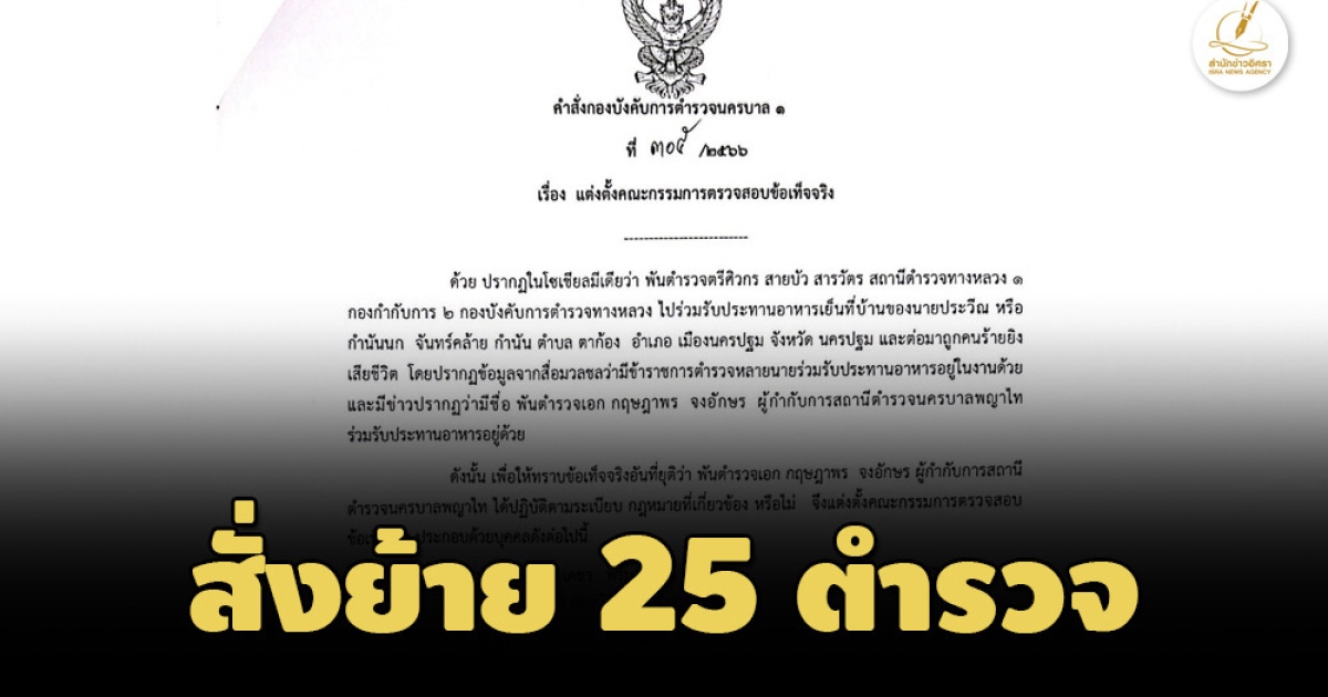 ผบ.ตร.สั่งย้ายตำรวจ 25 นาย เอี่ยวงานเลี้ยงเหตุยิงสารวัตรทางหลวง มาช่วย ศปก.ตร. ให้จเรตำรวจตรวจสอบข้อเท็จจริง ความเกี่ยวโยงทุกประเด็นทุกมิติ หากพบเป็นความผิดให้ดำเนินการเด็ดขาดทั้งอาญา วินัย