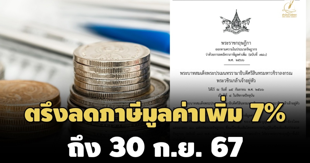 ราชกิจจาฯ แพร่ พ.ร.ฎ.ออกตามประมวลรัษฎากร ตึงลดภาษีมูลค่าเพิ่ม 7% ต่ออีก 1 ปี สิ้นสุด 30 ก.ย. 67