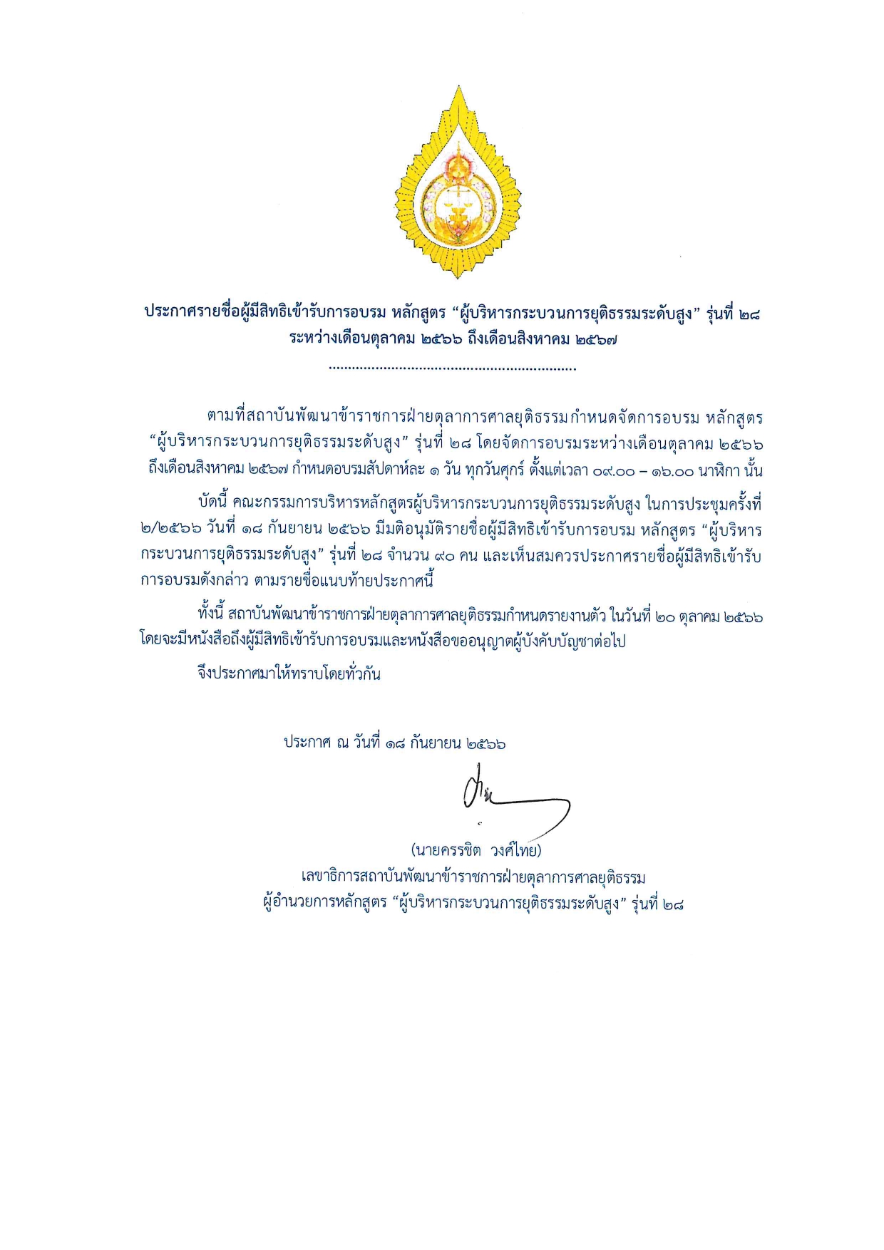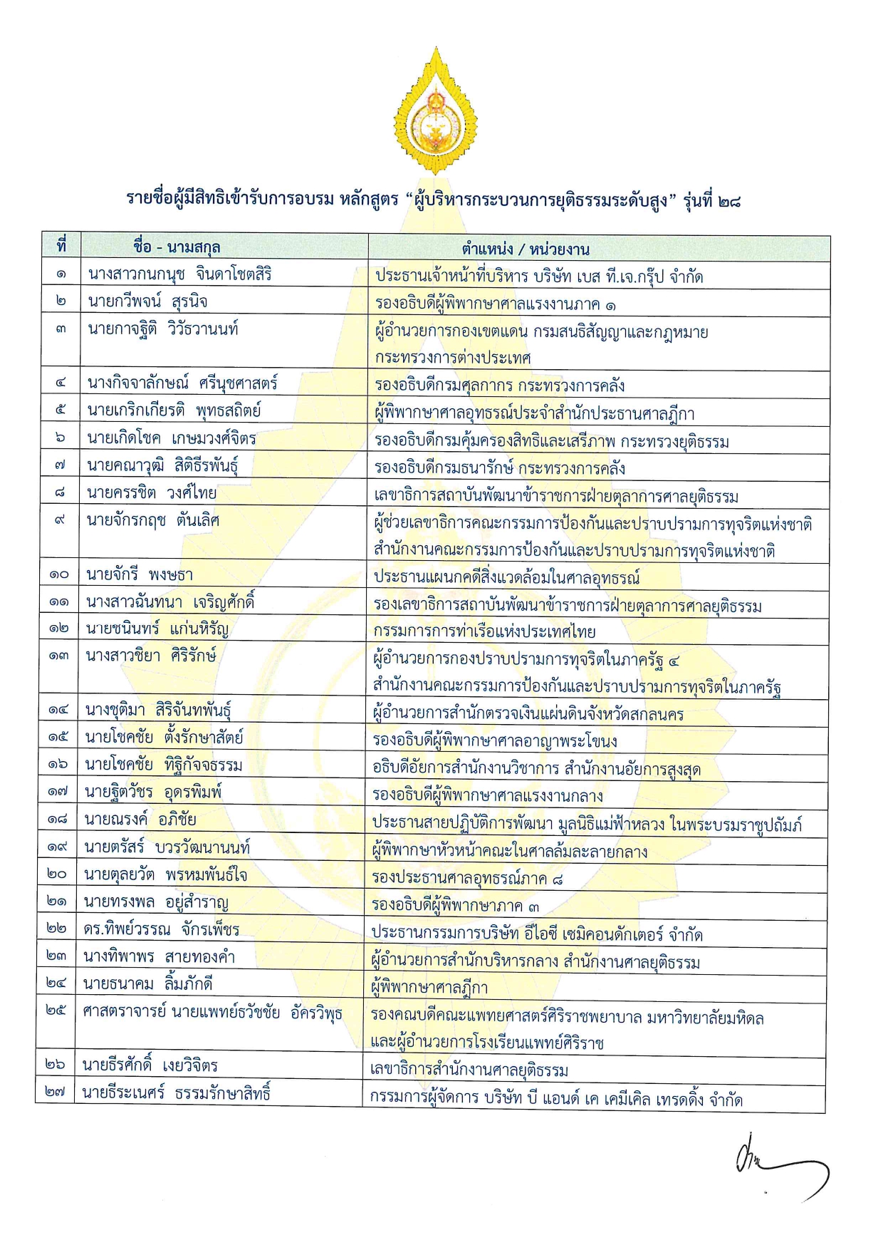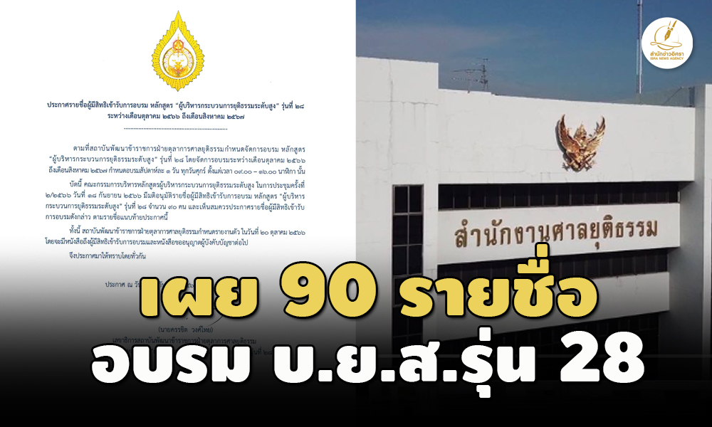 สำนักข่าวอิศรา (www.isranews.org) รายงานว่าเมื่อวันที่ 18 ก.ย. คณะกรรมการบริหารหลักสูตรผู้บริหารกระบวนการยุติธรรมระดับสูง (บ.ย.ส.) สถาบันพัฒนาข้าราชการฝ่ายตุลาการศาลยุติธรรม ได้จัดประชุมครั้งที่ 2/2566 และมีมติอนุมัติรายชื่อผู้มีสิทธิเข้ารับการอบรม หลักสูตร “ผู้บริหารกระบวนการยุติธรรมระดับสูง” รุ่นที่ 28 จํานวน 90 คน