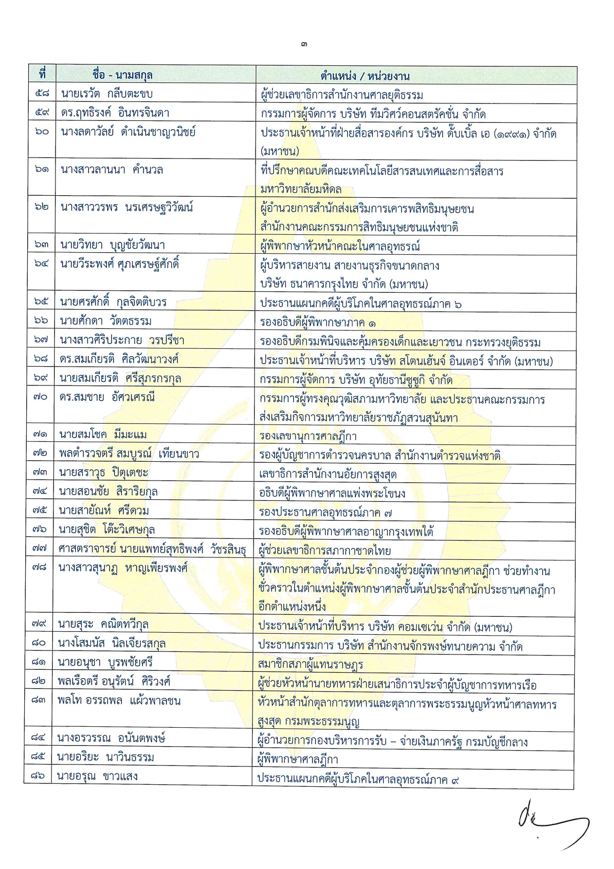 1.นายกวีพจน์ สุรนิจ รองอธิบดีผู้พิพากษาศาลแรงงานภาค 1 2.นางกิจจาลักษณ์ ศรีนุชศาสตร์ รองอธิบดีกรมศุลกากร 3.นายเกริกเกียรติ พุทธสถิต ผู้พิพากษาศาลอุทธรณ์ประจําสํานักประธานศาลฎีกา 4.นายเกิดโชค เกษมวงศ์จิตร รองอธิบดีกรมคุ้มครองสิทธิและเสรีภาพ 5.นายครรชิต วงศ์ไทย เลขาธิการสถาบันพัฒนาข้าราชการฝ่ายตุลาการศาลยุติธรรม